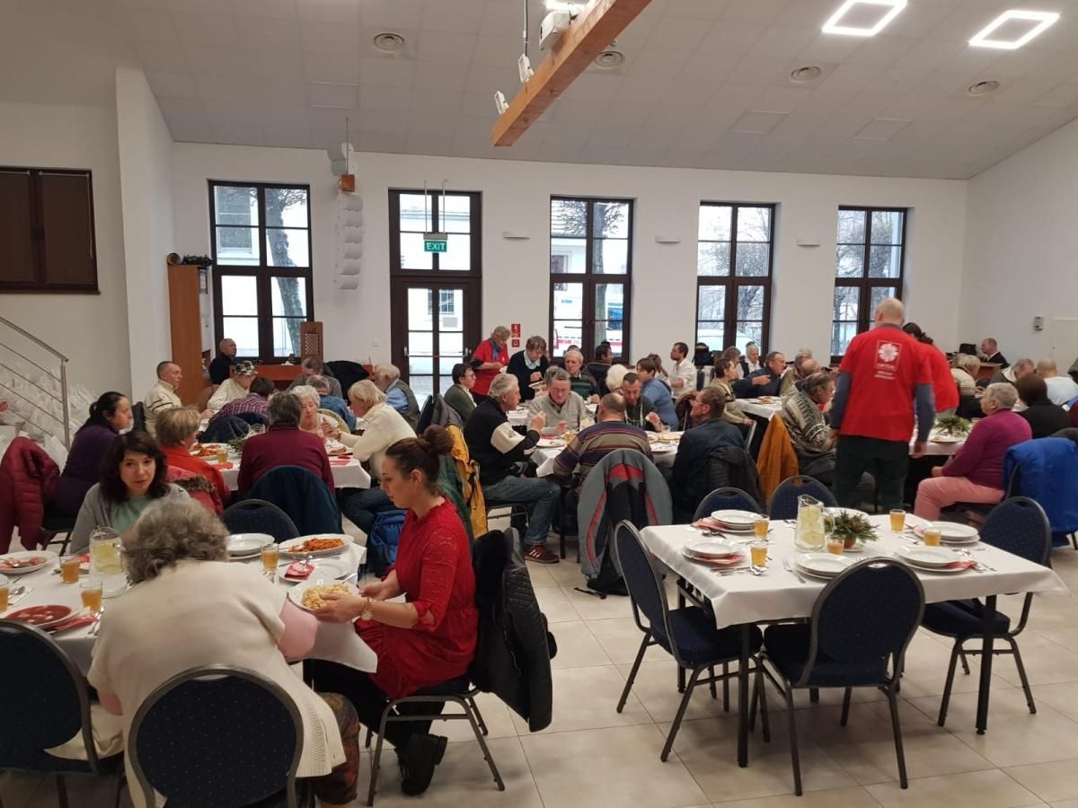 To było wyjątkowe święto dla parafian, mieszkańców miasta i okolicznych miejscowości. W nowoczesnej sali spotkań, z dobrze wyposażonym zapleczem, zorganizowana została Wigilia dla samotnych, bezdomnych i potrzebujących. Przy stołach nakrytych białymi obrusami i ozdobionymi stroikami zasiadło około 70 osób. Przybyły kobiety samotne i z dziećmi oraz mężczyźni.