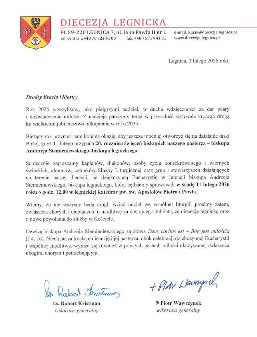11 lutego br. w legnickiej Katedrze w południe sprawowana będzie Msza św. z udziałem duchowieństwa i osób konsekrowanych. Będzie to okazja do świętowania jubileuszu i modlitwy za pasterza diecezji legnickiej.