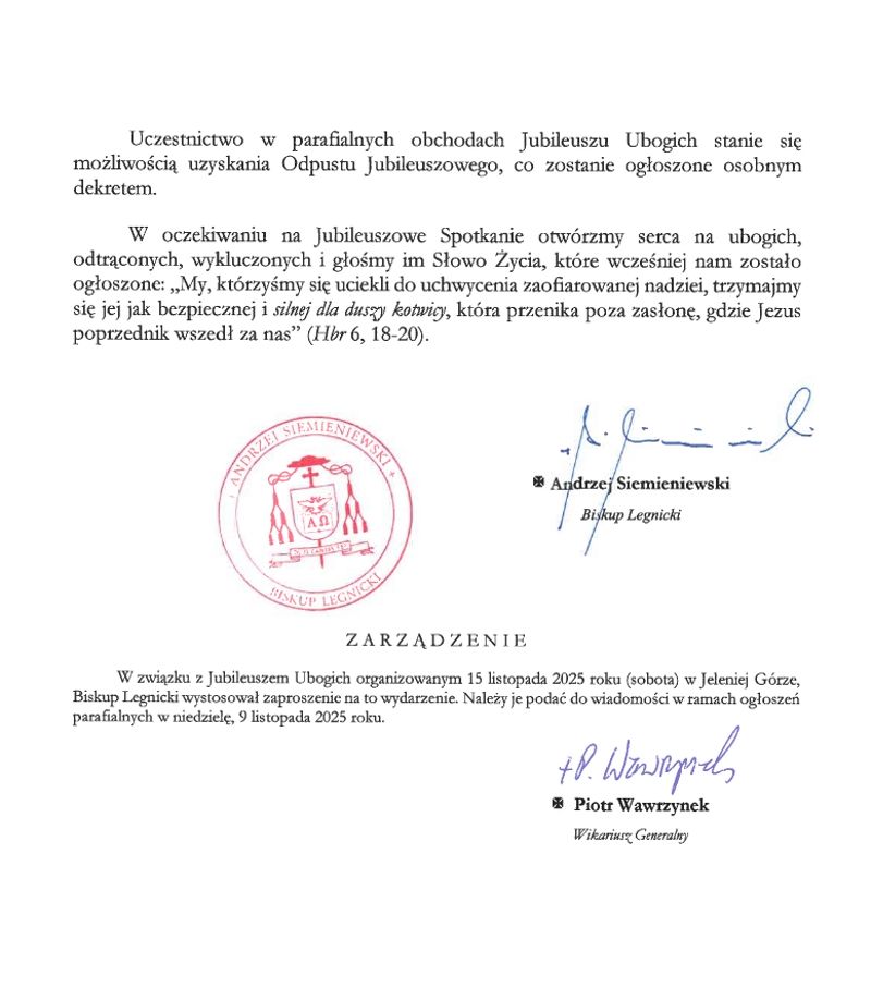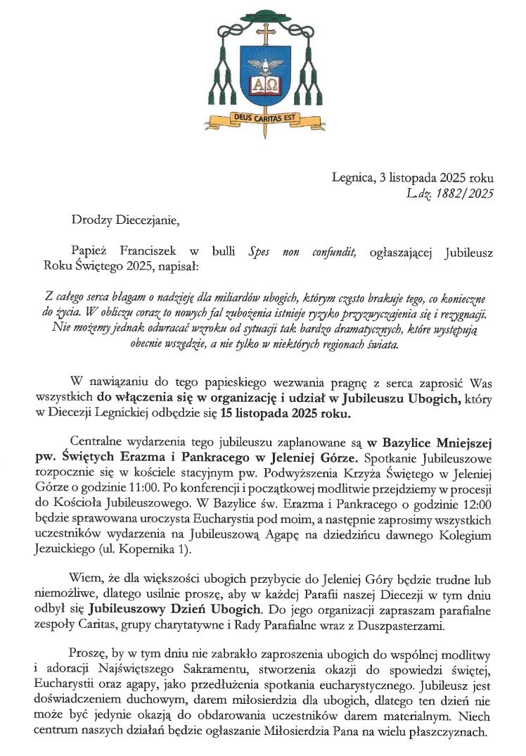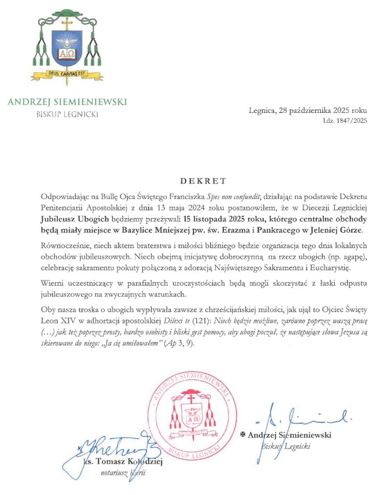- Odpowiadając na Bullę Ojca Świętego Franciszka Spes non confundit, postanowiłem, że w Diecezji Legnickiej Jubileusz Ubogich będziemy przeżywali 15 listopada 2025 roku. Centralne obchody będą miały miejsce w Bazylice Mniejszej pw. św. Erazma i Pankracego w Jeleniej Górze – czytamy w dekrecie bp. Andrzeja Siemieniewskiego informującym o wydarzeniu.