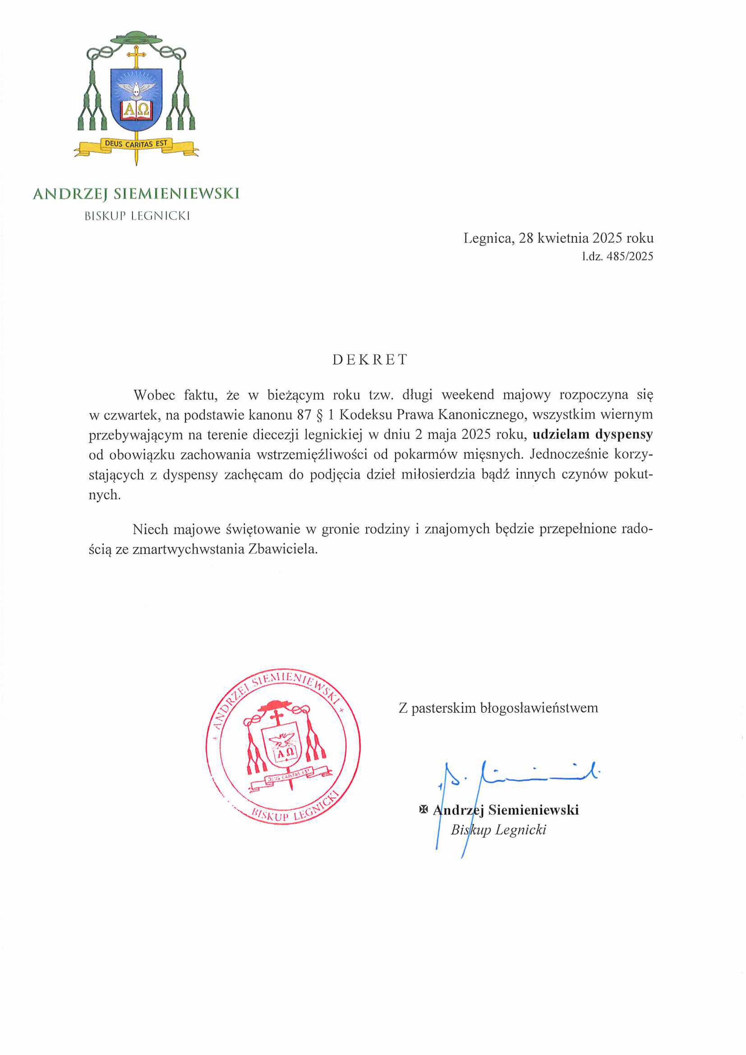 Biskup Legnicki Andrzej Siemieniewski udziela dyspensy dla wiernych diecezji legnickiej na piątek 2 maja 2025 r. Szczegóły w załączniku.