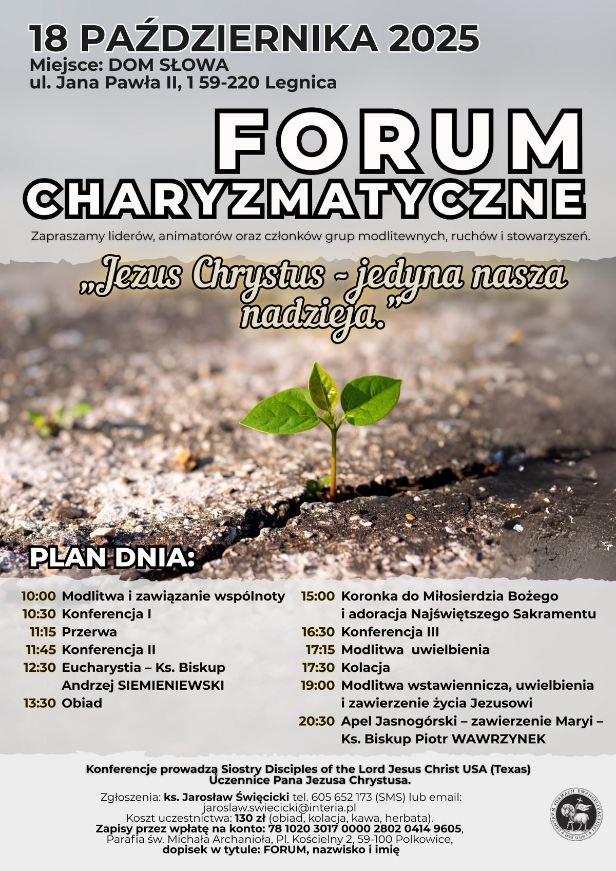 Forum Charyzmatyczne odbędzie się 18 października w Domu Słowa w Legnicy. Jest ono skierowane do wszystkich liderów, animatorów grup modlitewnych, wspólnot, ruchów i stowarzyszeń.