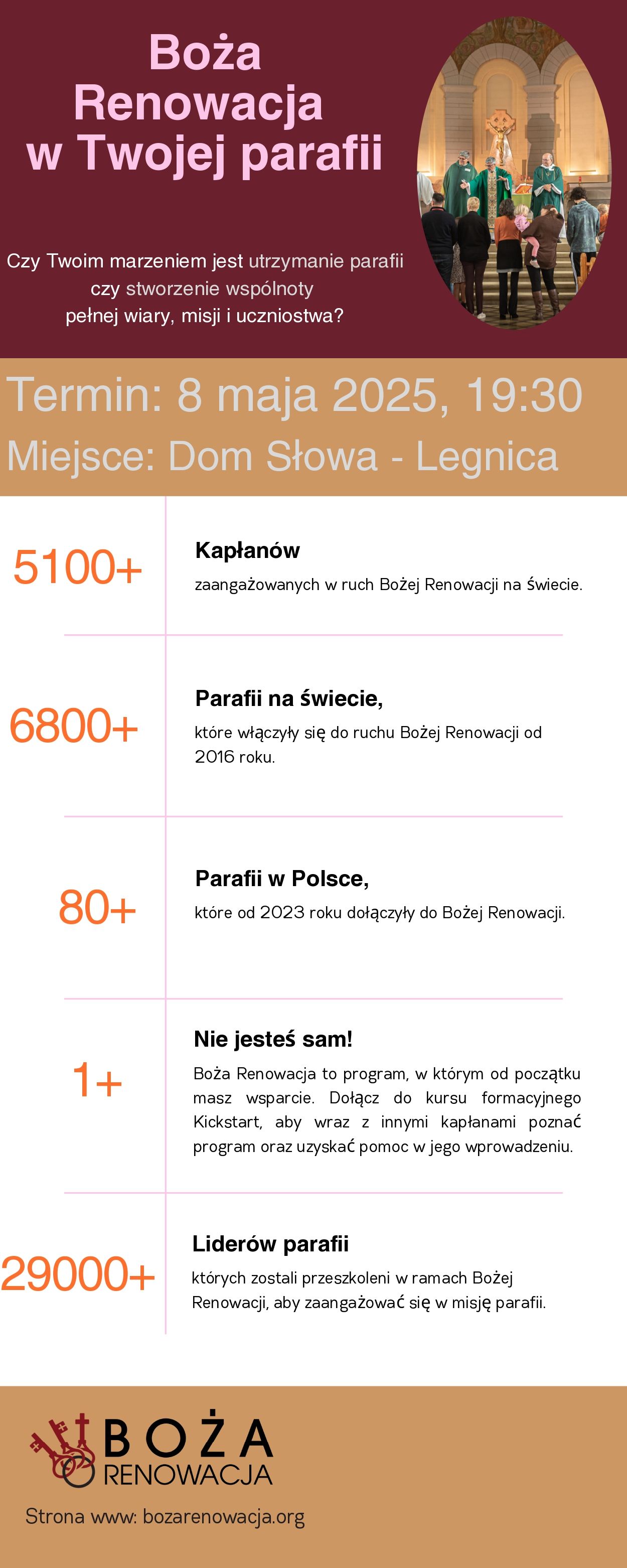 Zapraszamy Księży na spotkanie wprowadzające w program duszpasterski „Boża Renowacja”, który chcemy zaproponować parafiom diecezji legnickiej. Autorem programu jest kanadyjski proboszcz ks. James Mallon. Celem tego programu jest pomoc w odnowie i przemianie parafii według trzech priorytetów: pierwszeństwo ewangelizacji, zmiana kultury parafii i modlitwa. Spotkanie dla zainteresowanych księży z udziałem osób odpowiedzialnych za realizację programu odbędzie się 8 maja o g. 19.30 w Legnicy. Zapisy w Domu Słowa email: domslowa@diecezja.legnica.pl, tel.: +48 / 76-724-41-30, +48 511 712 949) Więcej informacji o programie na stronie:bozarenowacja.org/ . W przyszłym roku gościem w Legnicy będzie autor programu ks. James Mallon.