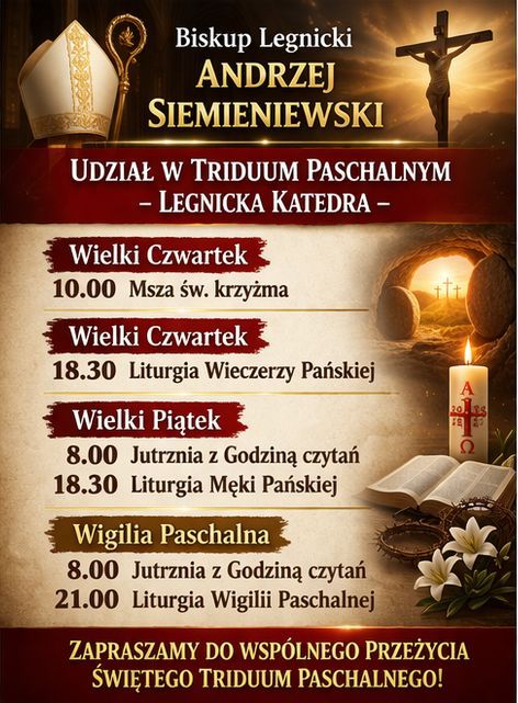 W czwartek 2 kwietnia rozpocznie się Triduum Paschalnej. Biskup Legnicki Andrzej Siemieniewski weźmie udział w liturgiach sprawowanych w katedrze legnickiej pw. św. Ap. Piotra i Pawła: