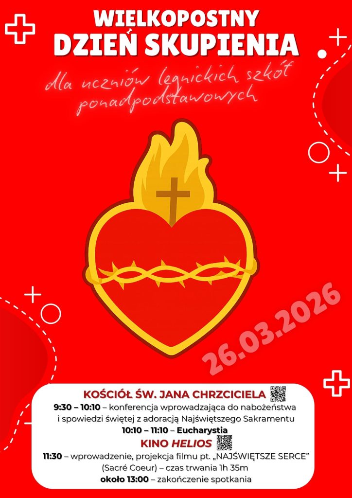 Serdecznie zapraszamy do wzięcia udziału w Wielkopostnym Dniu Skupienia dla uczniów legnickich szkół ponadpodstawowych. Szczegóły dotyczące zgłoszeń zostały przekazane do szkół i katechetów.