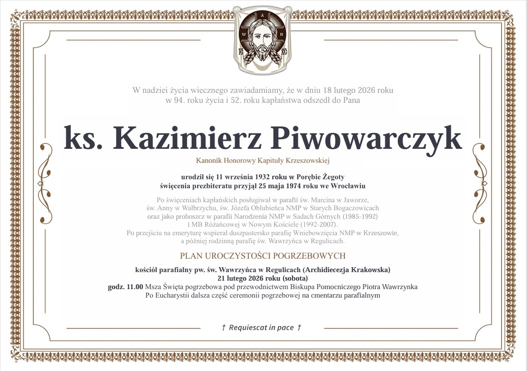 Archidiecezja krakowska poinformowała dziś o śmierci ks. Kazimierza Piwowarczyka, księdza diecezji legnickiej, mieszkającego na emeryturze na terenie archidiecezji krakowskiej.