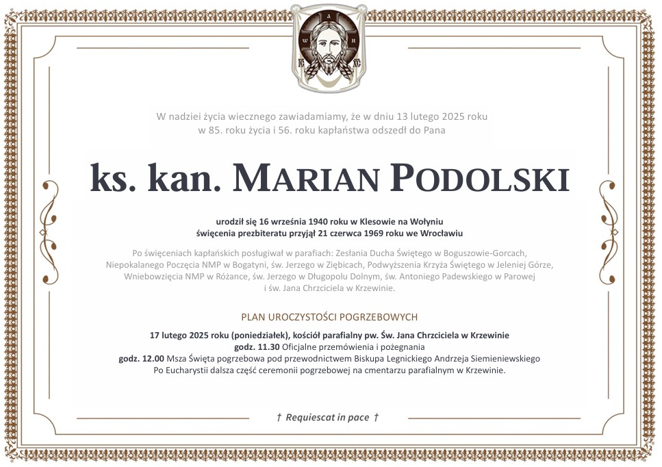 W nadziei życia wieczengo informujemy, że dziś nad ranem zmarł ks. Marian Podolski.