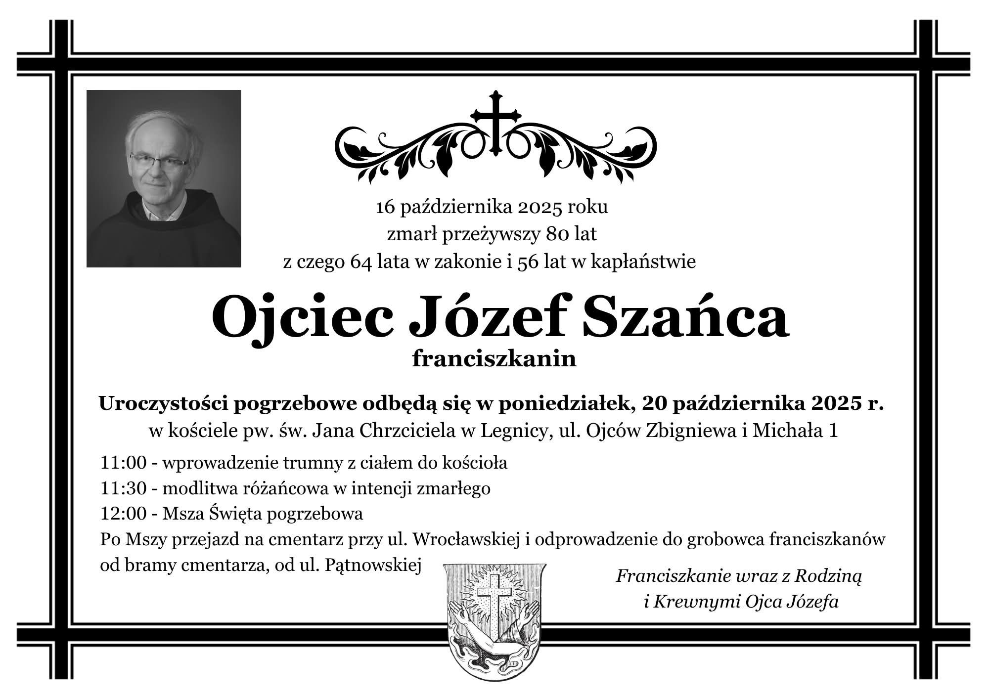 W poniedziałek 20.10 uroczystości pogrzebowe Ojca Józefa Szańcy w kościele św. Jana Chrzciciela, o. franciszkanów w Legnicy.