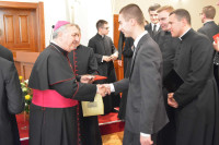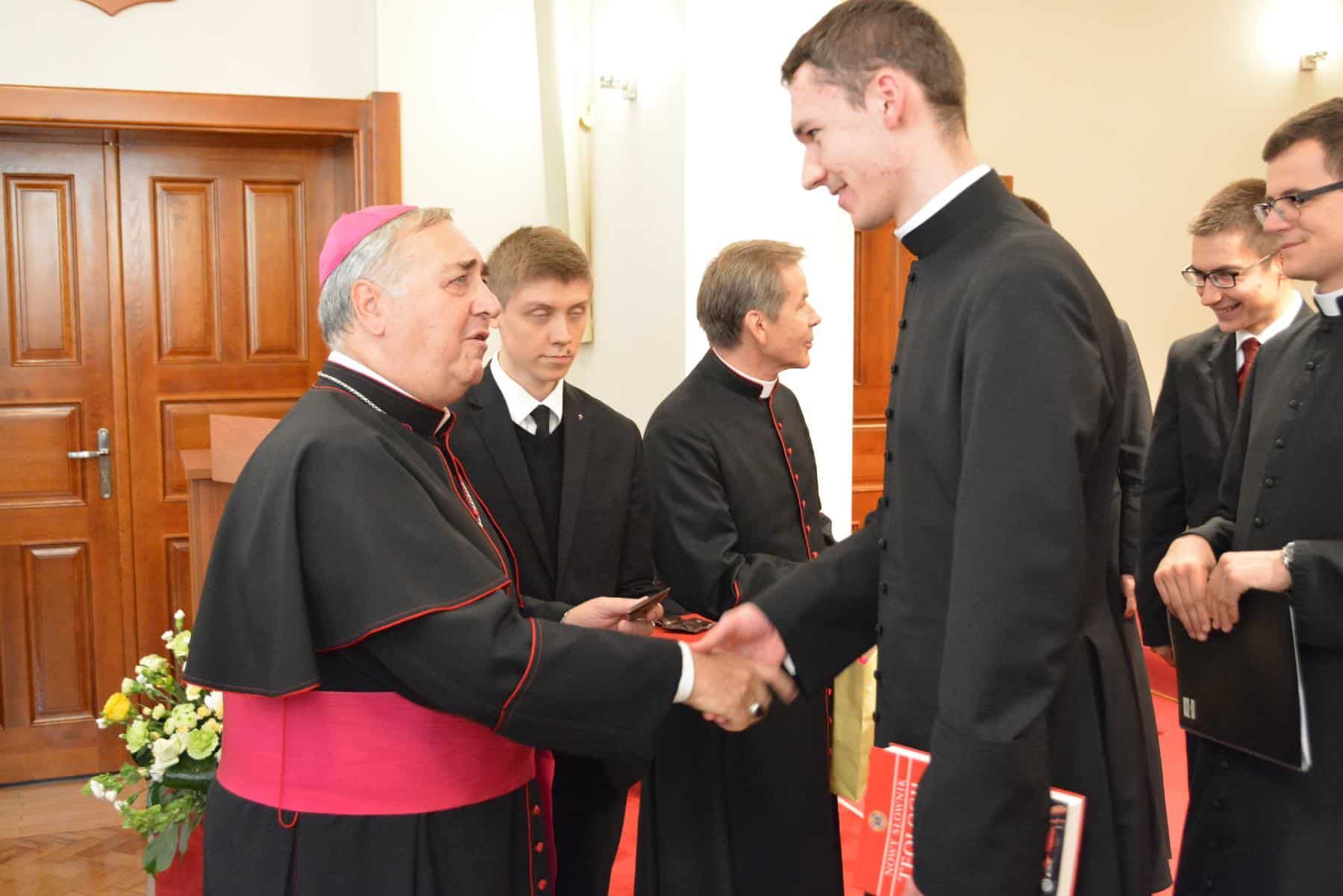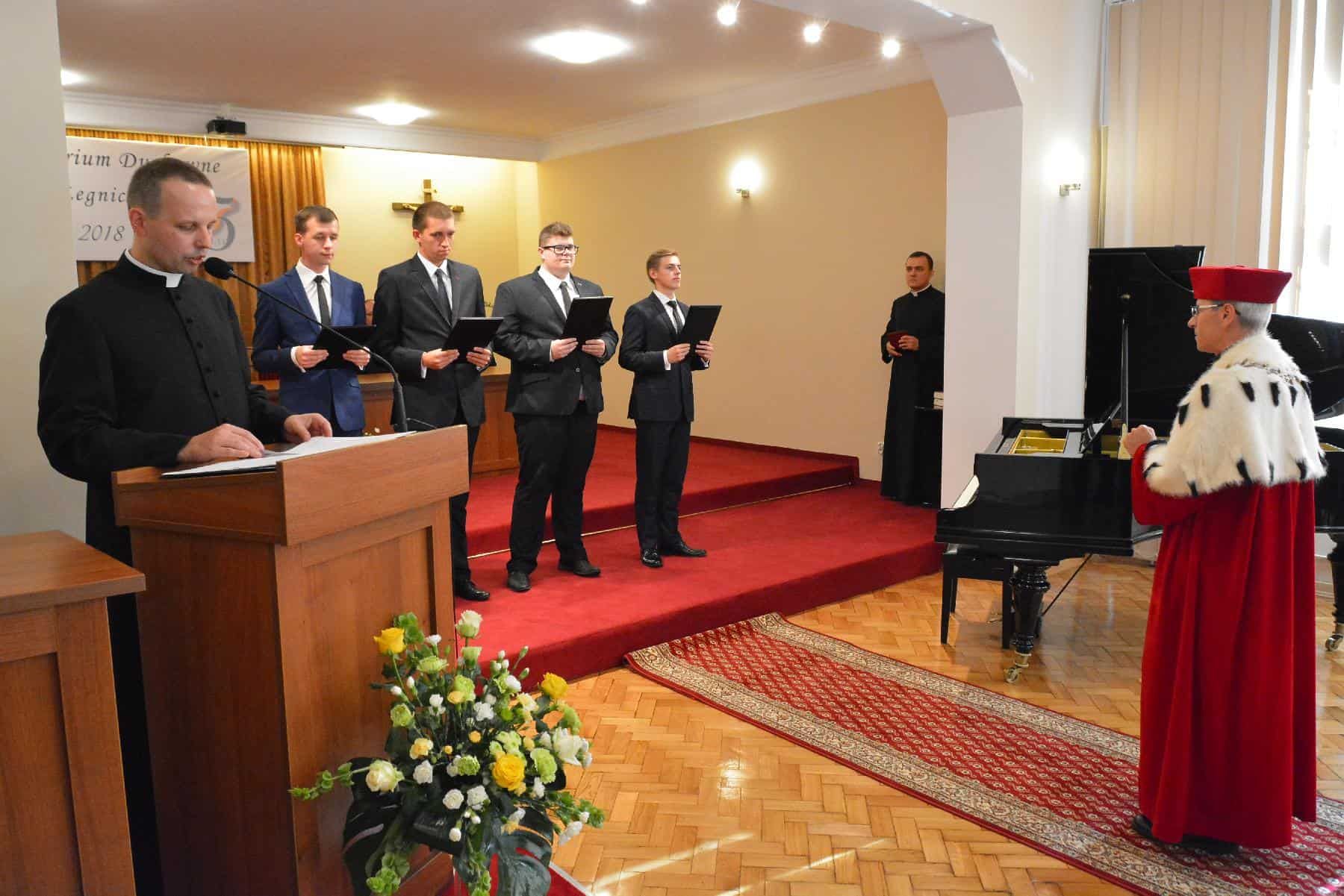 W szczególny sposób rektor seminarium ks. Piotr Kot powitał czterech kleryków I roku studiów, którym towarzyszyli rodzice i krewni. Wyraził radość z tego, że zdecydowali się rozpocząć naukę i formację seminaryjną. Na początku uroczystości nowi alumni złożyli przyrzeczenie, w którym zobowiązali się do pilnej nauki i osobistego zaangażowania się w formację ku kapłaństwu. Z rąk rektora PWT ks. Włodzimierza Wołyńca otrzymali indeksy studenckie. Natomiast biskup legnicki Zbigniew Kiernikowski wręczył nagrody klerykom, którzy w ubiegłym roku akademickim osiągnęli najlepsze wyniki naukowe.