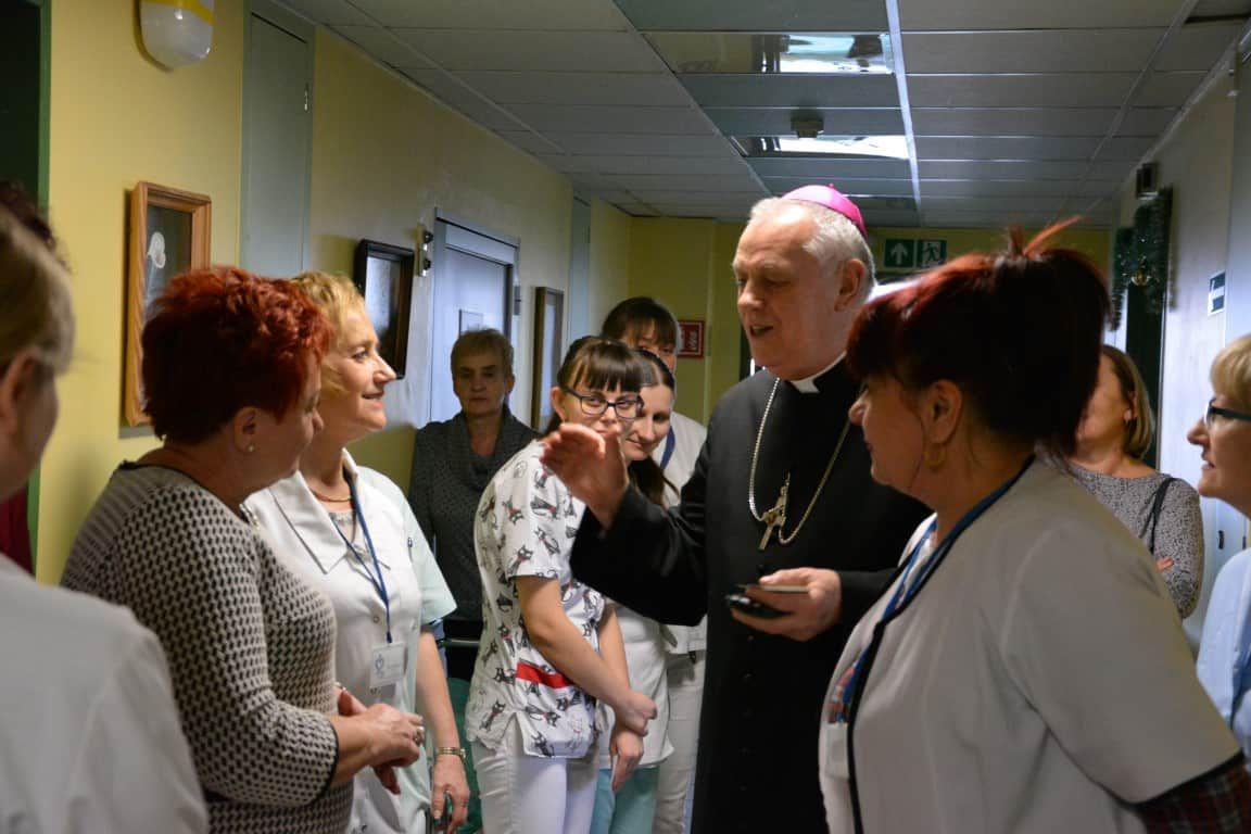 Tuż przed świętami Bożego Narodzenia biskup legnicki Zbigniew Kiernikowski odwiedził Oddział Medycyny Paliatywnej Legnickiego Szpitala Specjalistycznego w Legnicy. Podczas tego spotkania, które odbyło się w środę 20 grudnia, Ksiądz Biskup spotkał się z personelem oddziału, pacjentami i ich rodzinami. Wraz z dyrektor szpitala, lekarzem kierującym oddziałem, pielęgniarkami i opiekunkami bp Zbigniew odwiedził poszczególne sale oddziału, gdzie rozmawiał z chorymi, udzielił im błogosławieństwa.