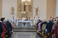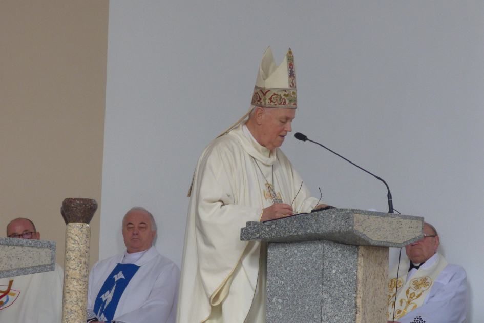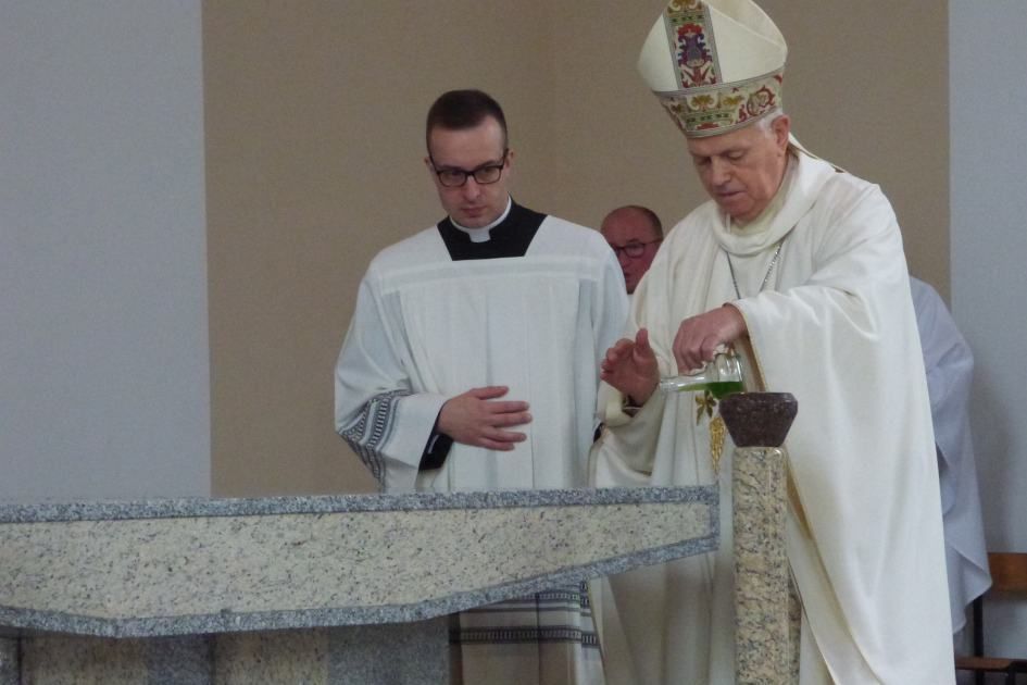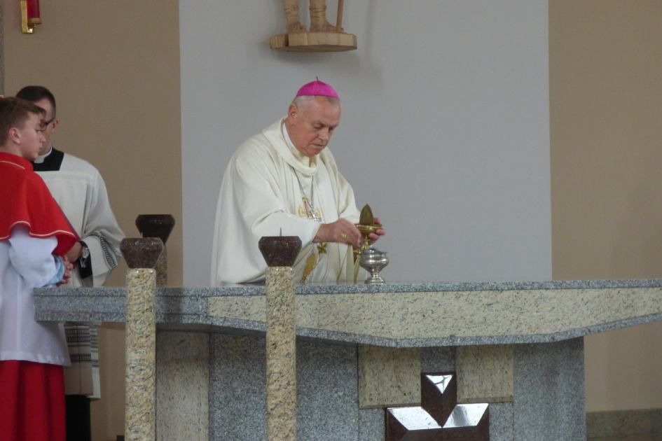 - Jesteśmy tu zgromadzeni, aby dokonać poświęcenia tej budowli, tego kościoła, wzniesionego trudem mieszkańców, wiernych tej parafii, proboszcza, wszystkich księży, którzy tu pracowali od samego początku, aż do tej chwili, że możemy dzisiaj powiedzieć: „dzieło jest po ludzku skończone”. Oddajemy, poświęcamy tę budowlę Bogu i wspólnocie wiary. Będziemy tutaj się gromadzić, po to, by przyjmować zamysł Boży, ducha Bożego, w odniesieniu do całego naszego życia, dać się formować, przemieniać, byśmy nie byli tylko ludźmi z tego świata, lecz mogli już partycypować w życiu Boga, w życiu wiecznym. O tym mówią nam wszystkie dzisiejsze modlitwy – mówił w wygłoszonej homilii Biskup legnicki.