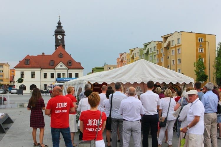 Tak jak zapowiadali, tuż przed godziną 16 w uroczystość Najświętszego Ciała i Krwi Chrystusa na lubińskim Rynku pojawiły się namioty ewangelizatorów, a oni sami rozpoczęli głoszenie mocy słowa. W centralnym namiocie kapłani wystawili Najświętszy Sakrament i prawie od razu pojawili się tam wierni, by na kolanach go adorować. Tak zaczęło się wydarzenie o nazwie "Jezus na Rynku".