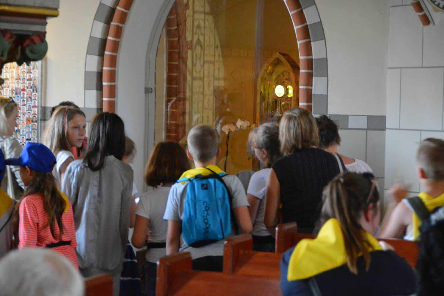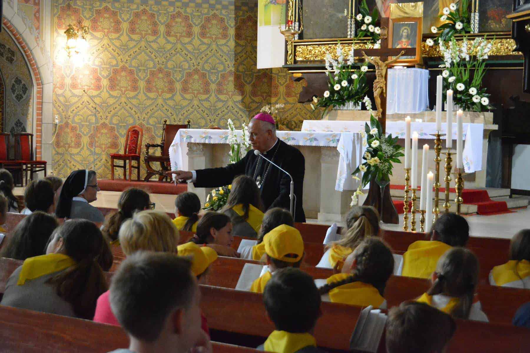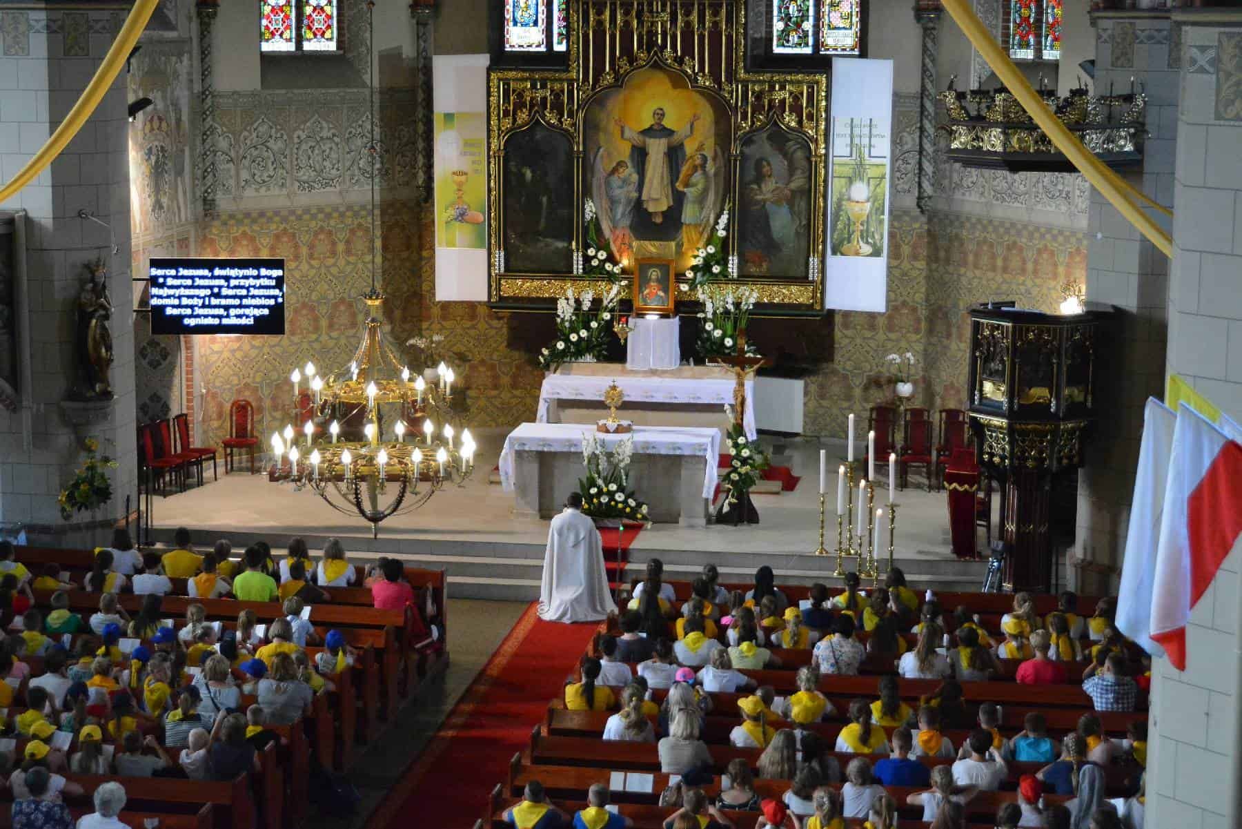 Przed wspólną Mszą św. Dzieci i opiekunowie wysłuchali świadectwa proboszcza miejsca ks. Andrzeja Ziombry, który mówił o Wydarzeniu Eucharystycznym i o relikwiach, jakie znajdują się w sanktuarium. Był też wspólny śpiew i litania do Serca Pana Jezusa przed wystawionym Najświętszym Sakramentem.