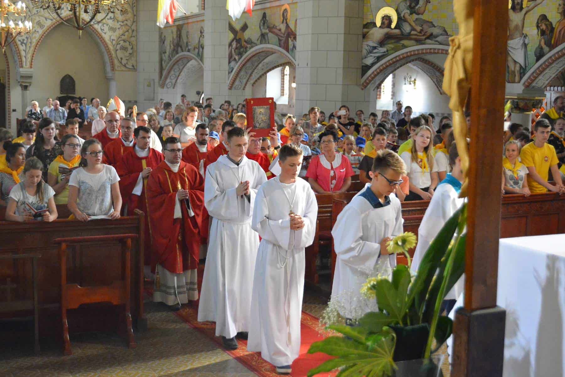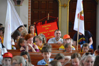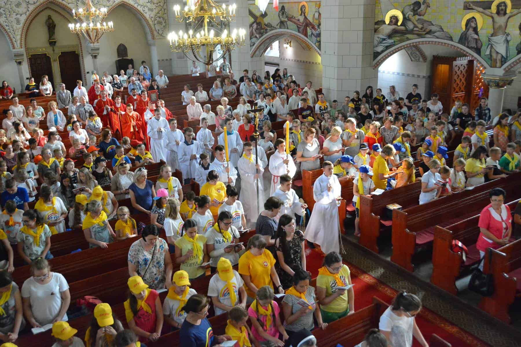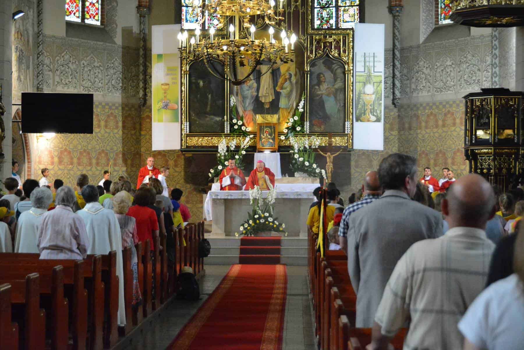 Przed wspólną Mszą św. Dzieci i opiekunowie wysłuchali świadectwa proboszcza miejsca ks. Andrzeja Ziombry, który mówił o Wydarzeniu Eucharystycznym i o relikwiach, jakie znajdują się w sanktuarium. Był też wspólny śpiew i litania do Serca Pana Jezusa przed wystawionym Najświętszym Sakramentem.