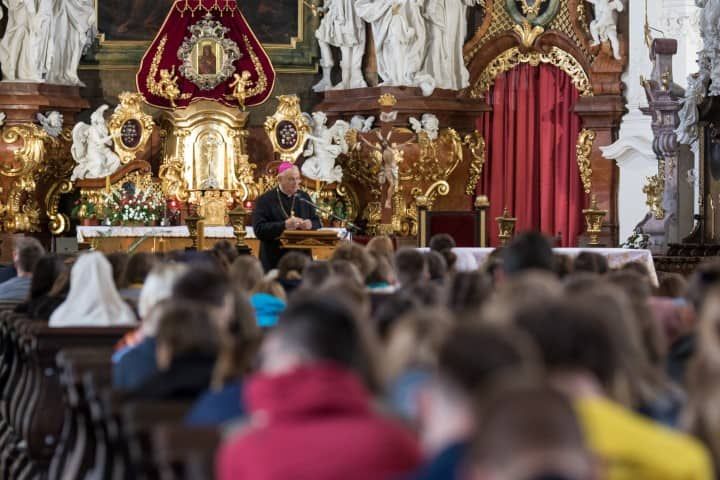 W piątek 12 lipca był kolejnym dniem pobytu studentów z FDNT w naszej diecezji. W tym dniu stypendyści odwiedzili Krzeszów, gdzie modlili się przed wizerunkiem Matki Bożej Łaskawej. W Krzeszowskiej bazylice przeżyli swój dzień skupienia, który poprowadził biskup legnicki Zbigniew Kiernikowski.