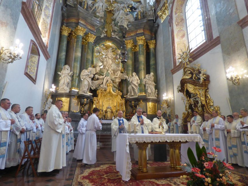 Eucharystii w intencji wszystkich pielgrzymów przewodniczył ks. Mariusz Majewski – były przewodnik legnickiej pielgrzymki w gronie ponad 40 księży, zarówno tych, którzy pieszo wędrowali, ale i tych, którzy przyjechali z pielgrzymami autokarami.
