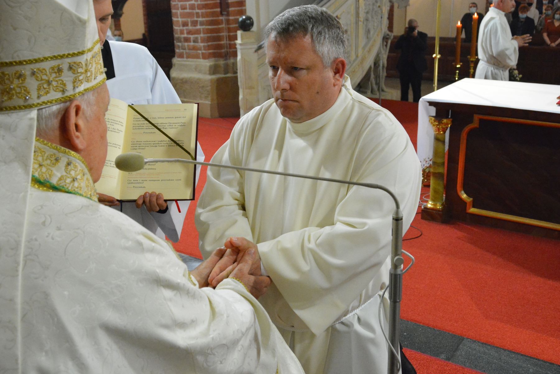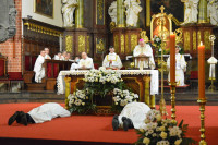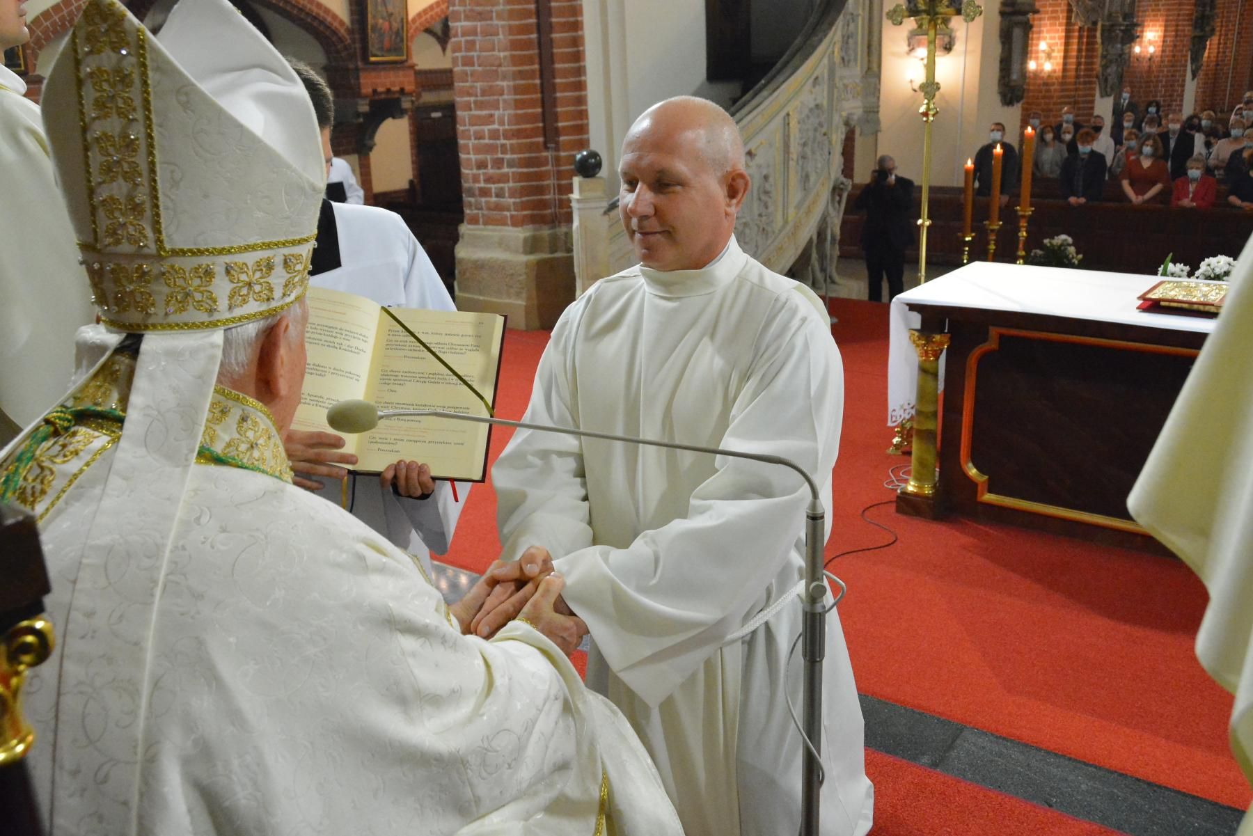 - To nadzwyczajna uroczystość, moment historyczny w naszej diecezji. Wyświęcamy na diakonów stałych dwóch mężczyzn. Czynimy to ze względu na dobro wspólnoty Kościoła, by mógł on coraz bardziej być sługą tajemnicy Jezusa Chrystusa – powiedział biskup legnicki na rozpoczęcie uroczystości.