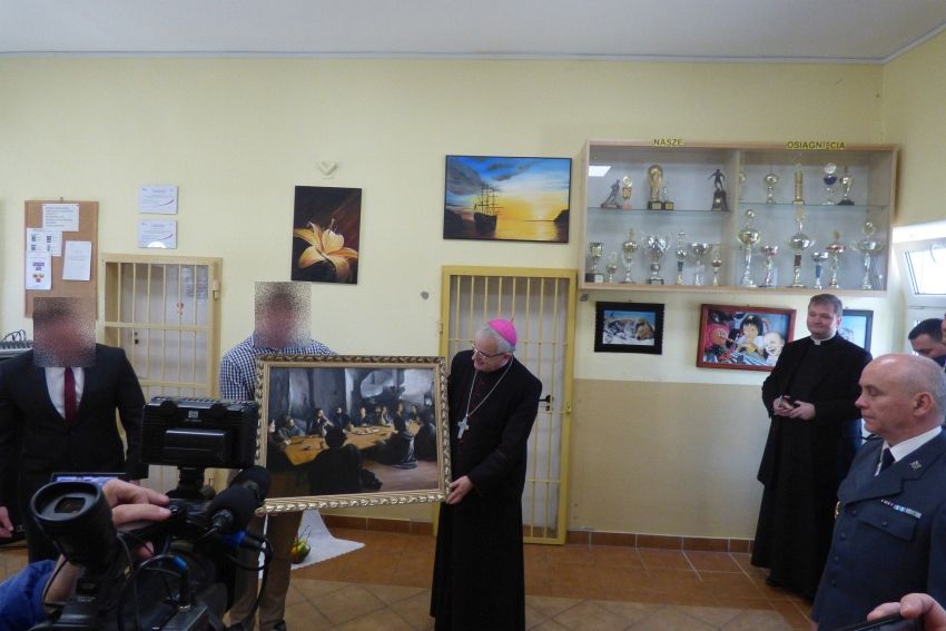 - Dziękujemy za obecność wśród nas księdza Biskupa, który w przededniu świąt Wielkanocnych pomaga nam przekroczyć pewien próg nadziei. Niech dar Bożej miłości i dar ludzkiej przyjaźni, towarzyszy naszym niełatwym dniom. Gorąco się o to modlimy i o tą modlitwę prosimy księdza Biskupa – mówili przedstawiciele więźniów zapraszając do udziału w przygotowanym przedstawieniu teatralno-muzycznym i przekazując na jego ręce swój podarunek, w postaci obrazu namalowanego przez jednego z więźniów, pt. Ostatnia Wieczerza.