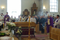 Eucharystii przewodniczył biskup legnicki Zbigniew Kiernikowski. - Pan Bóg, zabrał go spośród nas – patrząc po ludzku – w sposób nieoczekiwany. Zadbał o to, aby był tam, gdzie On sam jest, gdzie jest mieszkań wiele – mówił w wygłoszonej homilii ksiądz Biskup - Ks. Andrzej tego Pana znał i stale poznawał, pośród trudności, i dziś już jest po drugiej stronie, w tym mieszkaniu, które Pan przygotował, Ten, który jest Drogą, Prawdą i Życiem. I tej Drogi, nikt nie zniekształci, tej drogi krzyża ku zmartwychwstaniu; i tej Prawdy, którą jest grzeszność człowieka i przebaczenie ze strony Boga – nikt nie może zanegować, bo Bóg jest wierny; i tego Życia nikt nie odbierze, bo rodzi się ono, powstaje, z tajemnicy krzyża, z tajemnicy śmierci. Dziękujemy Bogu za jego życie i za jego posługę.