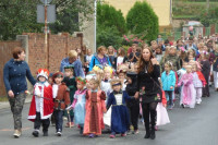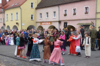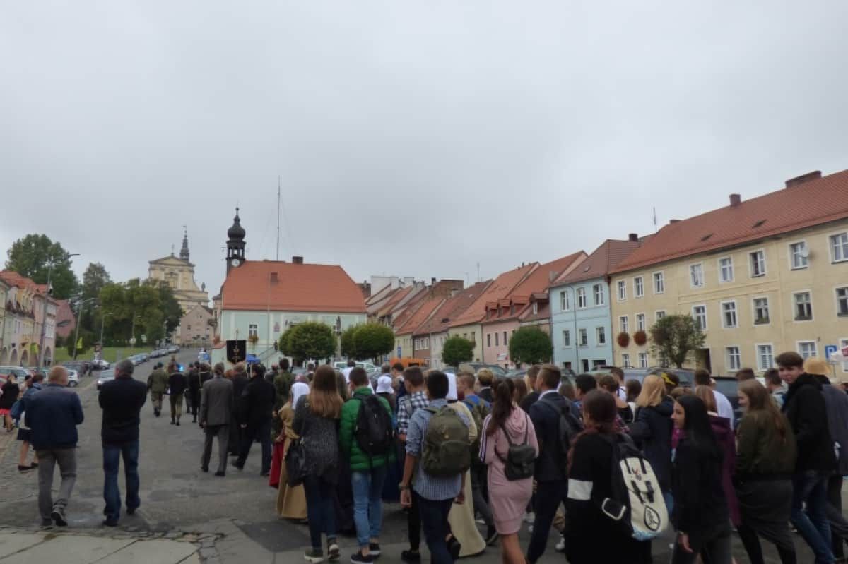 Korowód z udziałem dzieci, młodzieży i dorosłych, przebranych w stroje średniowieczne, przeszedł przez miasto już po raz czwarty. Od kościoła pomocniczego pw. Podwyższenia Krzyża św., do kościoła parafialnego, droga przebiegała przez Rynek miasta. Tu zatrzymano się, aby przy odegraniu hymnu państwowego, dokonać wciągnięcia polskiej flagi na maszt. Oddana też została okolicznościowa salwa. Powitano też wszystkich uczestników i przybyłych gości. Natomiast grupa uczniów ze SP z pobliskiej Pławnej, wykonała pokaz tańców dawnych. Przejściu korowodu, towarzyszyła także podobna muzyka.