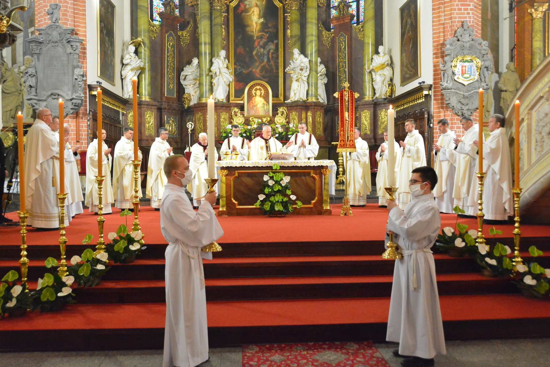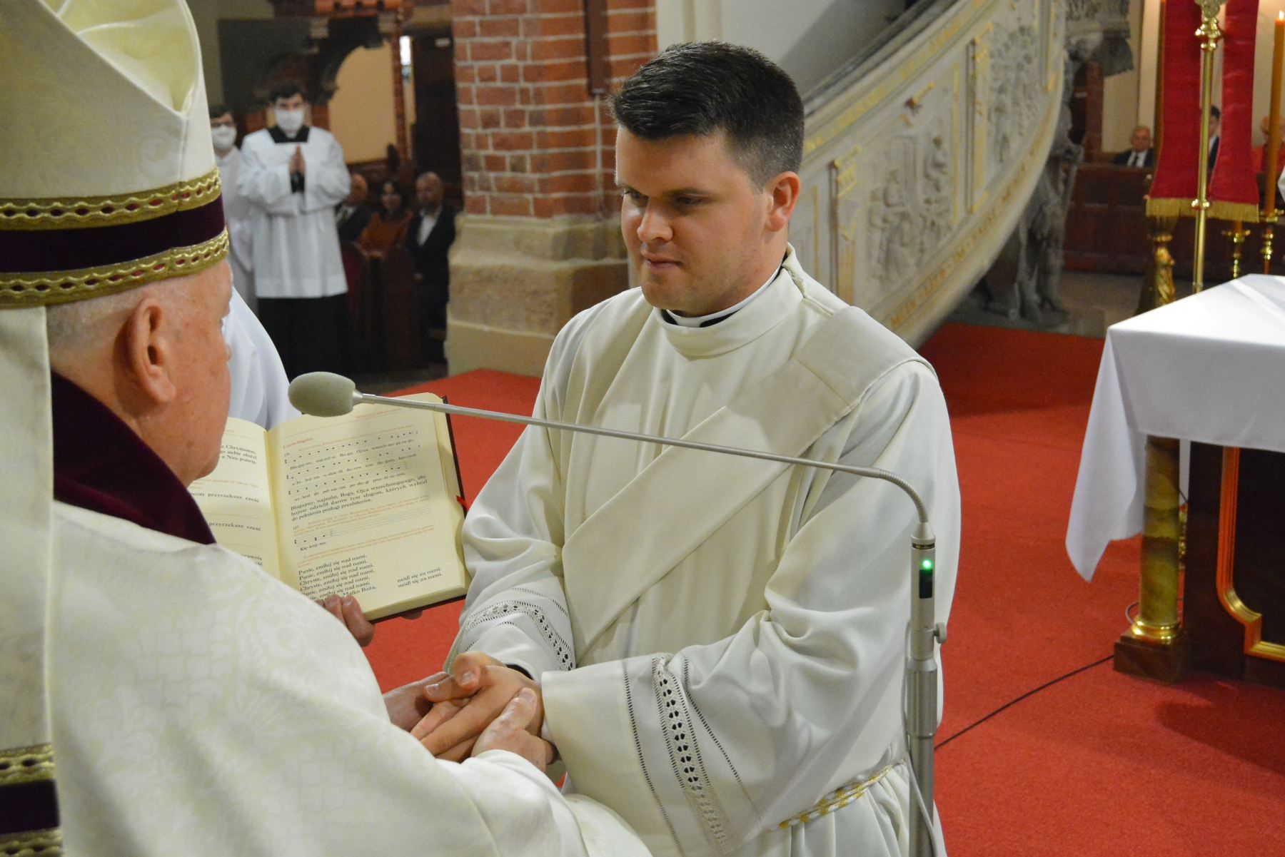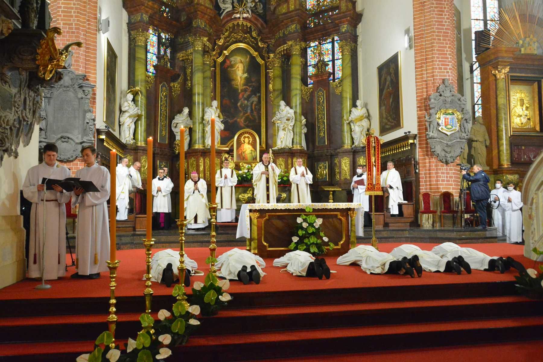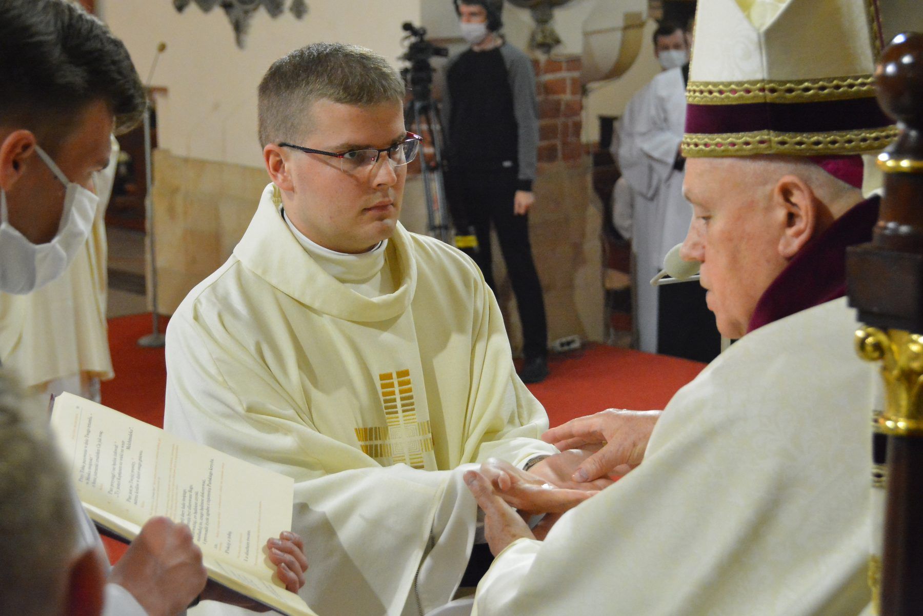 W południe w katedrze sprawowana była uroczysta Eucharystia, której przewodniczył biskup legnicki Zbigniew Kiernikowski, podczas której 6 diakonów przyjęło święcenia prezbiteratu. W uroczystości, ze względu na panujące ograniczenia, wzięli udział jedynie bliscy kandydatów do kapłaństwa oraz zaproszeni goście. Obecny był także biskup senior Stefan Cichy, przełożeni seminarium oraz księża z parafii, z których diakoni pochodzą i w których odbywali praktyki duszpasterskie oraz siostry zakonne. - Dziś przyjmujecie na siebie zadanie i misję bycia sługami Słowa i sakramentów w stopniu prezbiteratu – powiedział bp Zbigniew Kiernikowski rozpoczynając uroczystość.