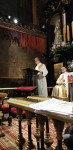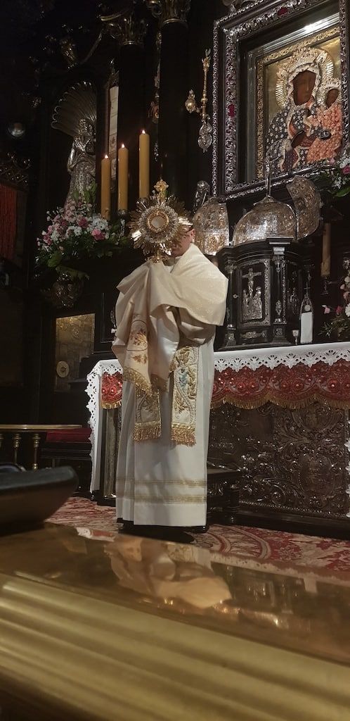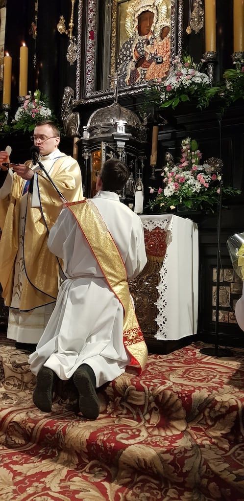 Czuwanie rozpoczęło się Apelem Jasnogórskim o godz. 21, po którym w kaplicy Matki Bożej Częstochowskiej zostali uczestnicy naszej pielgrzymki; tylko podczas takiego spotkania u Matki mieli oni możliwość bycia tak blisko i tak długo w ciszy przed wizerunkiem Królowej Polski. W konferencji wprowadzającej ks. Mateusz Rycek powiedział, że na tym miejscu wypada więcej słuchać niż mówić. Następnie miała miejsce modlitwa różańcowa, podczas której dk. Adam prowadził rozważania części bolesnej, zawierające wyjątki z Jasnogórskich Ślubów Narodu Polskiego kard. Wyszyńskiego. Dopełnieniem modlitwy była Nowenna do Matki Bożej Jasnogórskiej, z odczytaniem mnóstwa intencji złożonych przez pielgrzymów. W tych zapisanych na kartkach lub przedstawianych w sercu Maryi intencjach, o północy była sprawowana Eucharystia, która stanowiła centrum i najważniejszą część nocnego czuwania. W homilii dk. Adam nawiązał do wydarzenia na weselu w Kanie Galilejskiej, gdzie Maryja jest nazwana przez ewangelistę Matką Jezusa. „Wszystkie odczytane i niewypowiedziane modlitwy i intencje pokazują, jak wielki jest brak wina w naszym życiu. Maryja o tym wie i wiele z nich załatwia poza naszymi plecami. To, co mówimy Maryi, ma nas doprowadzić do spotkania z Jezusem, który przez śmierć na krzyżu - swoją Krwią -nasze brudy złożone w stągwie zamienia w najlepsze wino. (…) W Eucharystii Kana może stać się/staje się tu i teraz; ważne, aby pozwolić się Matce doprowadzić do Syna”- powiedział m.in. dk. Adam.