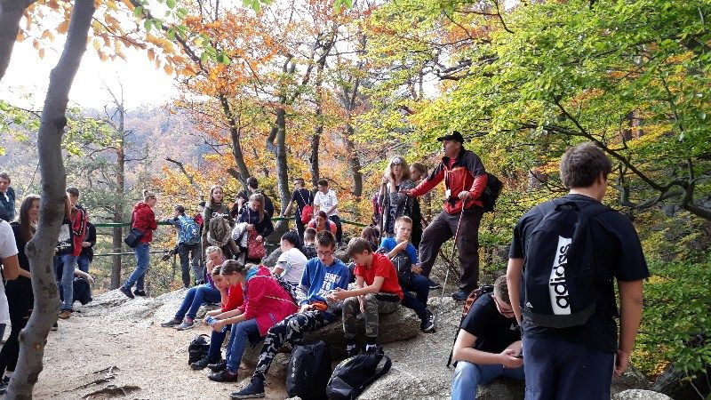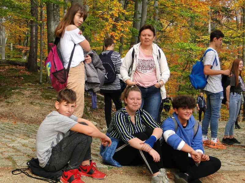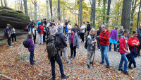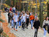 Po Mszy św. posililiśmy nasze ciała słodkimi bułeczkami. Około południa wyruszyliśmy na papieski szlak, prowadzeni przez przewodnika górskiego pana Krzysztofa Dwojaka, który starał się przekazać uczestnikom jak najwięcej informacji nie tylko na temat szlaku, którym szliśmy, ale także opowiadał wiele ciekawostek dotyczących Karkonoskiego Parku Narodowego.