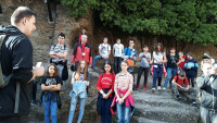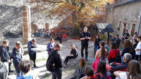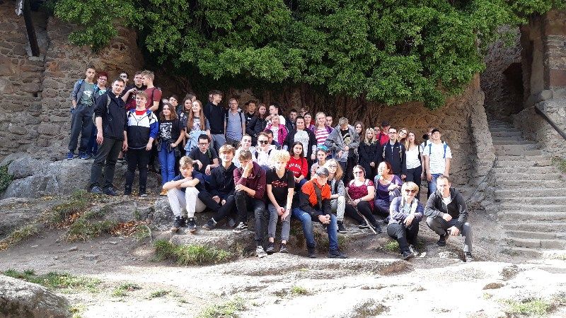 Po prawie godzinnym marszu, stanęliśmy na dziedzińcu zamkowym i tam mogliśmy odpocząć, zwiedzić Chojnik, ale przede wszystkim zatrzymać się na chwilę refleksji i modlitwy, którą poprowadził ks. Przemysław Milewski. Niestety w tym roku, ze względu na trwający remont i prace konserwatorskie, nie mogliśmy stanąć pod pamiątkową tablicą, która umieszczona została w ruinach dawnej kaplicy zamkowej.