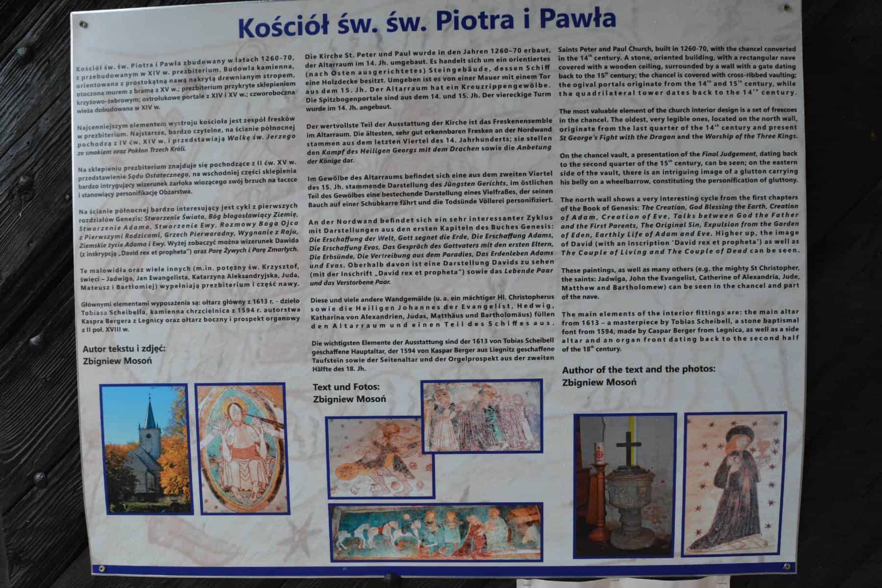 Warto zaznaczyć, że kościół filialny pw. św. Piotra i Pawła to jeden z najstarszych zabytków sakralnych diecezji legnickiej. Został wzniesiony w latach 1260-1270. W jego wnętrzu znajdziemy cenne polichromie, tzw. biblię pauperum, czyli biblię dla ubogich, wśród których największe to przedstawienie św. Krzysztofa, pokłon Trzech Króli, stworzenie świat, sąd ostateczny, czy walka św. Jerzego ze smokiem. Na uwagę zasługuje również ołtarz boczny z płaskorzeźbą ukazującą Ostatnią Wieczerzę oraz XVI wieczna kamienna chrzcielnica.