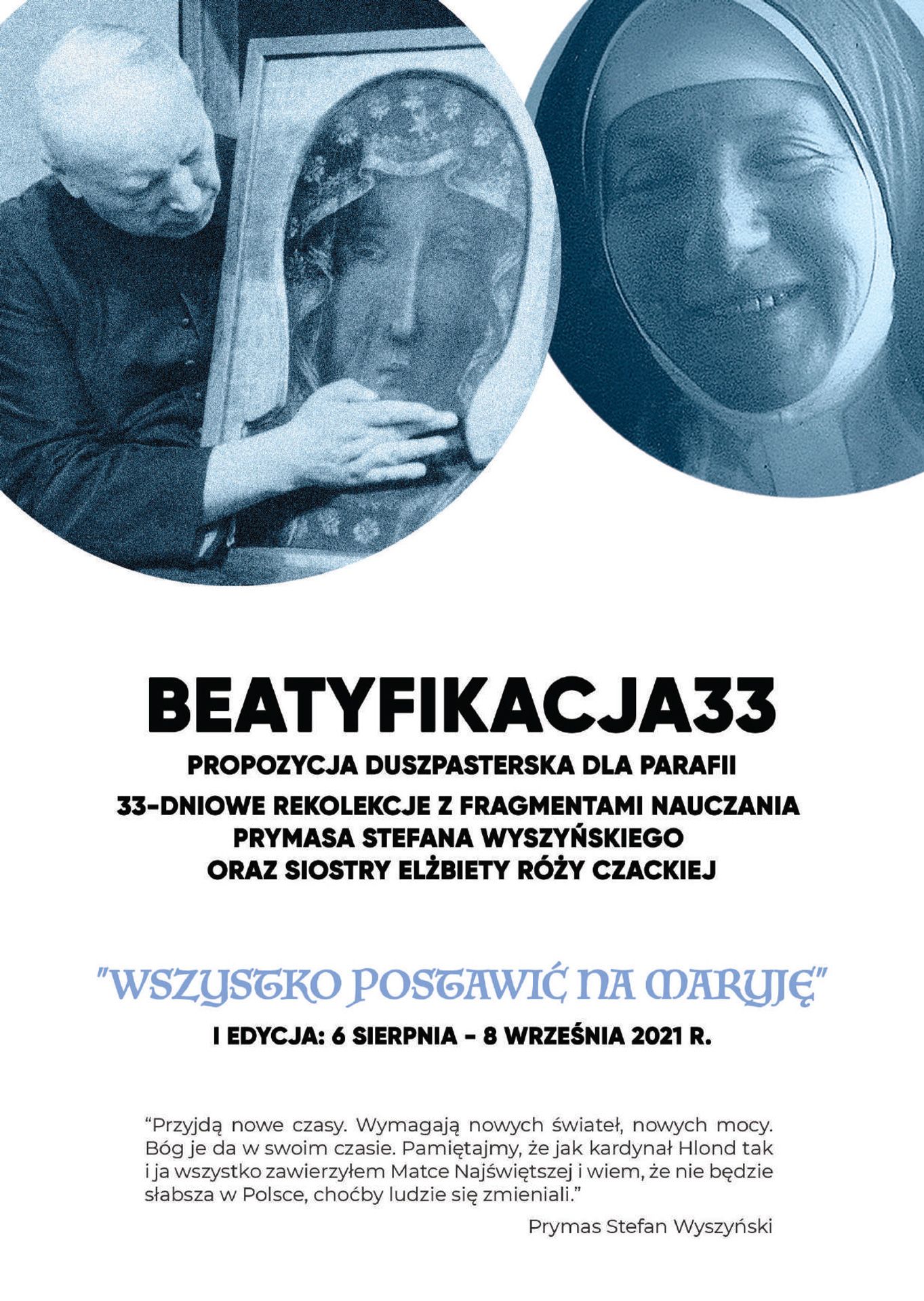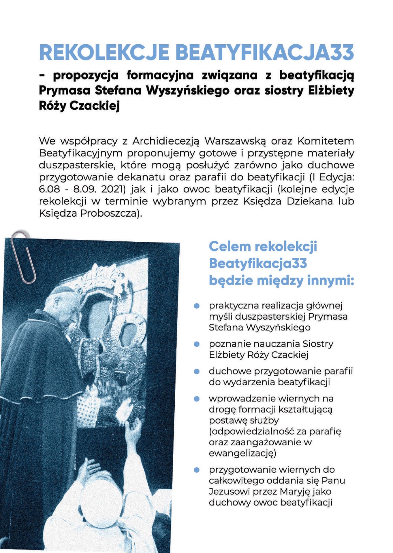 Fundacja TOTA TUA e współpracy z Archidiecezją Warszawską oraz Komitetem Beatyfikacyjnym proponujemy gotowe i przystępne materiały duszpasterskie, które mogą posłużyć zarówno jako duchowe przygotowanie do beatyfikacji (I Edycja: 6.08 - 8.09. 2021) jak i jako owoc beatyfikacji (kolejne Edycje).