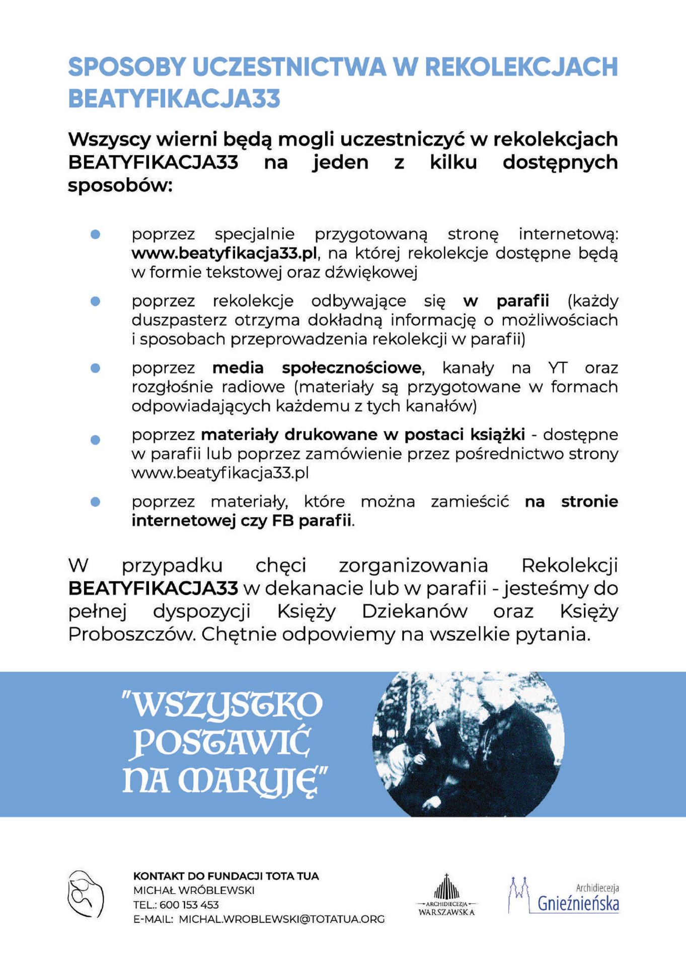 W razie chęci zamówienia materiałów drukowanych można to będzie zrobić przez stronę internetową, adres mailowy: kontakt@beatyfikacja33.pl lub pod numerem telefonu: 600 153 453.