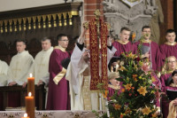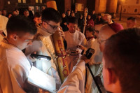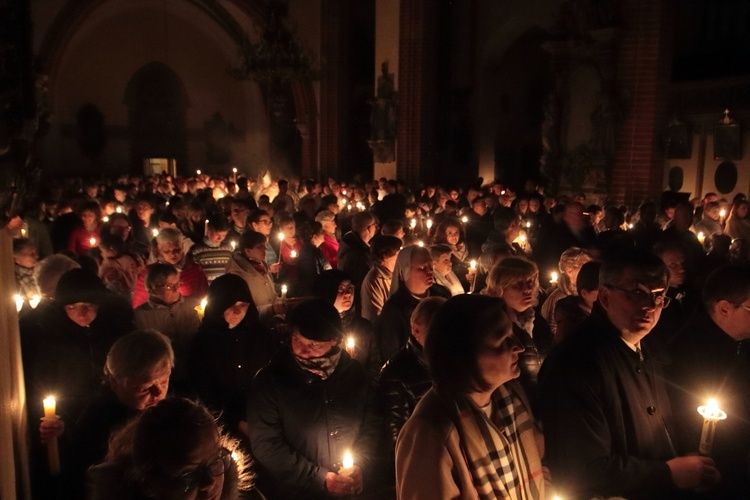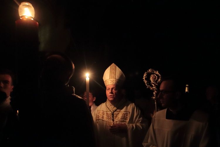 Równo o godz. 22 z zakrystii legnickiej katedry w ciszy wyruszyła procesja do ogniska znajdującego się przy wejściu do świątyni. Tam biskup legnicki Zbigniew Kiernikowski poświęcił ogień i paschał. Tak rozpoczęła się najważniejsza liturgia chrześcijan - Wigilia Paschalna.