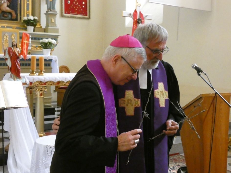 Podczas sprawowanej Liturgii Słowa, głos zabrali wspomniani biskupi i ks. Erich Busse, który złożył swego rodzaju świadectwo podjętej przez siebie działalności, którą określił mianem „budowania mostów między narodami”. Wręczył też krzyże wykonane z drutu z Muru Berlińskiego. Po wspólnej modlitwie wiernych, odmówieniu modlitwy Ojcze nasz i błogosławieństwie biskupów, nastąpił moment odsłonięcia pamiątkowej tablicy, umieszczonej na jednej ze ścian kościoła.