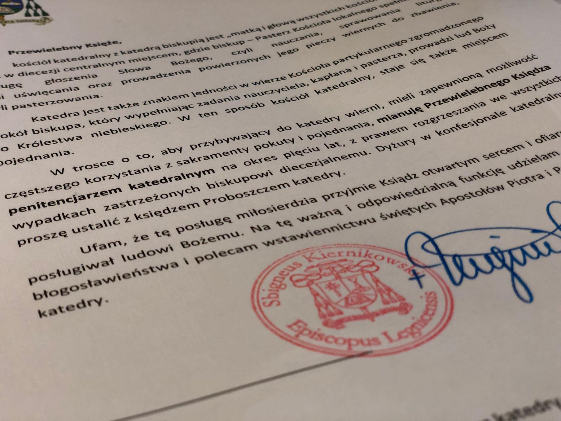 W trosce o to, aby przybywający do katedry wierni, mieli zapewnioną możliwość częstszego korzystania z sakramenty pokuty i pojednania, Biskup Legnicki w dniu 18 lutego br. powołał nowych penitencjarzy katedralnych z prawem rozgrzeszania we wszystkich wypadkach zastrzeżonych biskupowi diecezjalnemu.