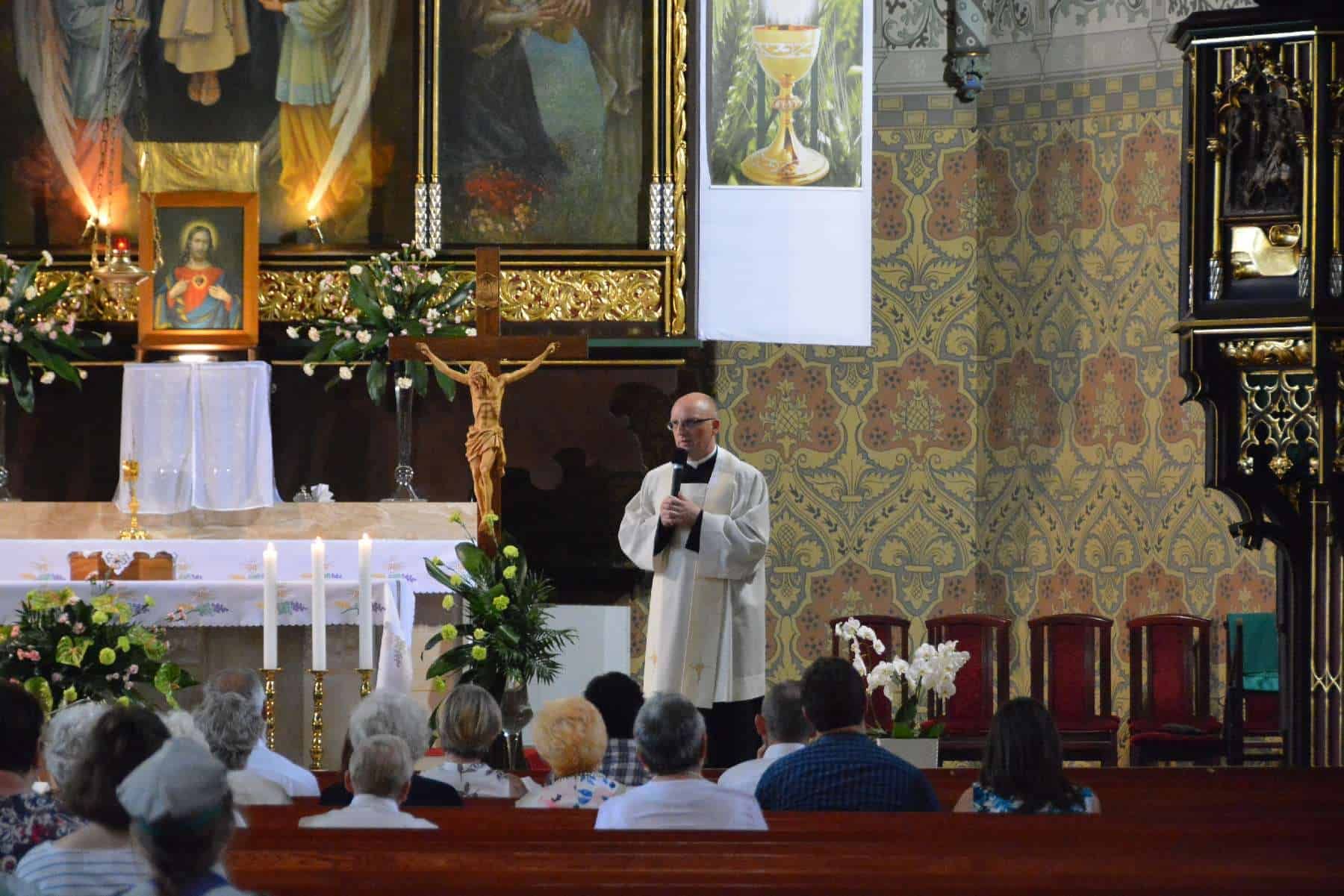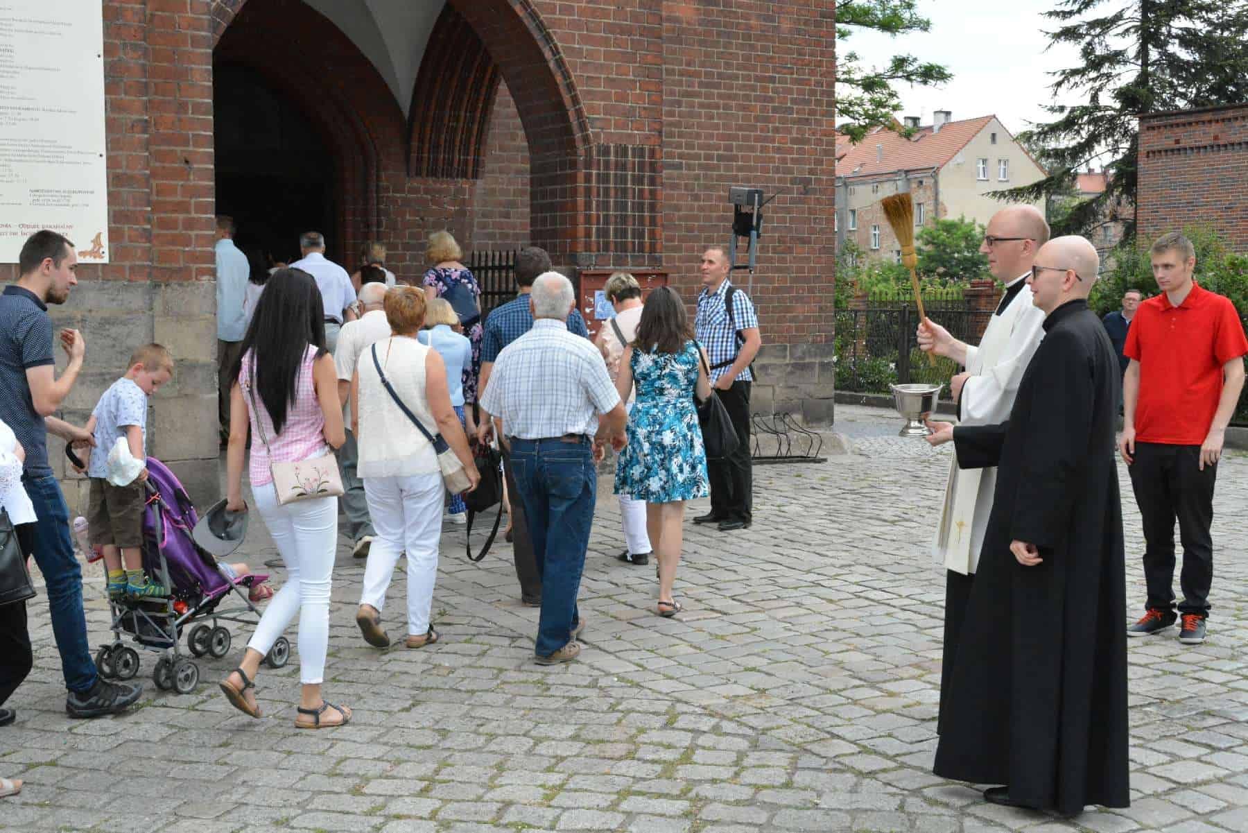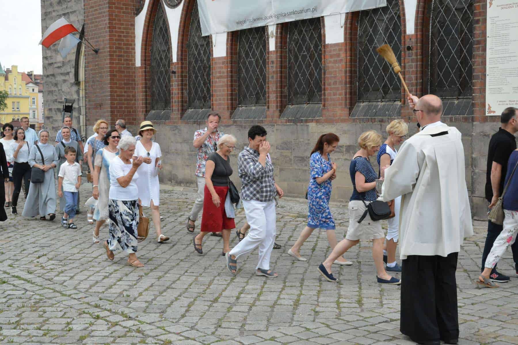 Po wspólnej modlitwie z kościoła Matki Bożej Królowej Polski wyruszył Marsz w kierunku sanktuarium św. Jacka, miejsca Wydarzenia Eucharystycznego. W drzwiach świątyni pielgrzymów powitał proboszcz ks. Andrzej Ziombra. Następnie wygłosił on krótką katechezę dotyczącą Cudu Eucharystycznego. Kolejnym punktem spotkania była adoracja Najświętszego Sakramentu oraz nabożeństwo czerwcowe, ku czci Najświętszego Serca Pana Jezusa. Po litanii zaproszeni małżonkowie podzielili się swoimi świadectwami dotyczącymi sposobów realizacji miłości małżeńskiej i odpowiedzialnego rodzicielstwa.