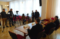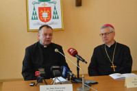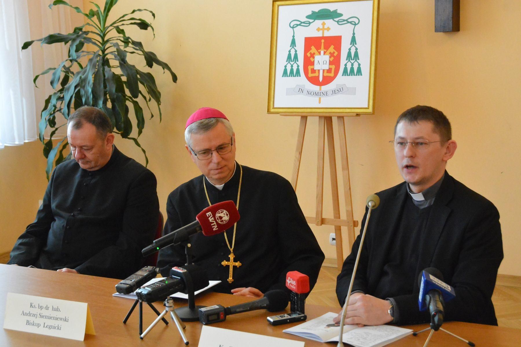 Dziś przed południem w auli Domu Słowa w Legnicy odbyła się konferencja prasowa przed święceniami biskupimi, które odbędą się w sobotę 15 kwietnia o g. 10,00 w legnickiej katedrze. Gośćmi spotkania z mediami byli: biskup legnicki Andrzej Siemieniewski, biskup nominat Piotr Wawrzynek oraz ks. Tomasz Kołodziej - ceremoniarz katedralny. Było to pierwsze spotkanie z mediami Biskupa nominata. Była okazja do przedstawienia się, omówienia symboliki herbu biskupiego i wezwania, jakie będzie towarzyszyło Biskupowi w posłudze pasterskiej. Omówiona została również liturgia święceń, a Biskup legnicki zaprosił do modlitwy i udziału w sobotniej uroczystości.