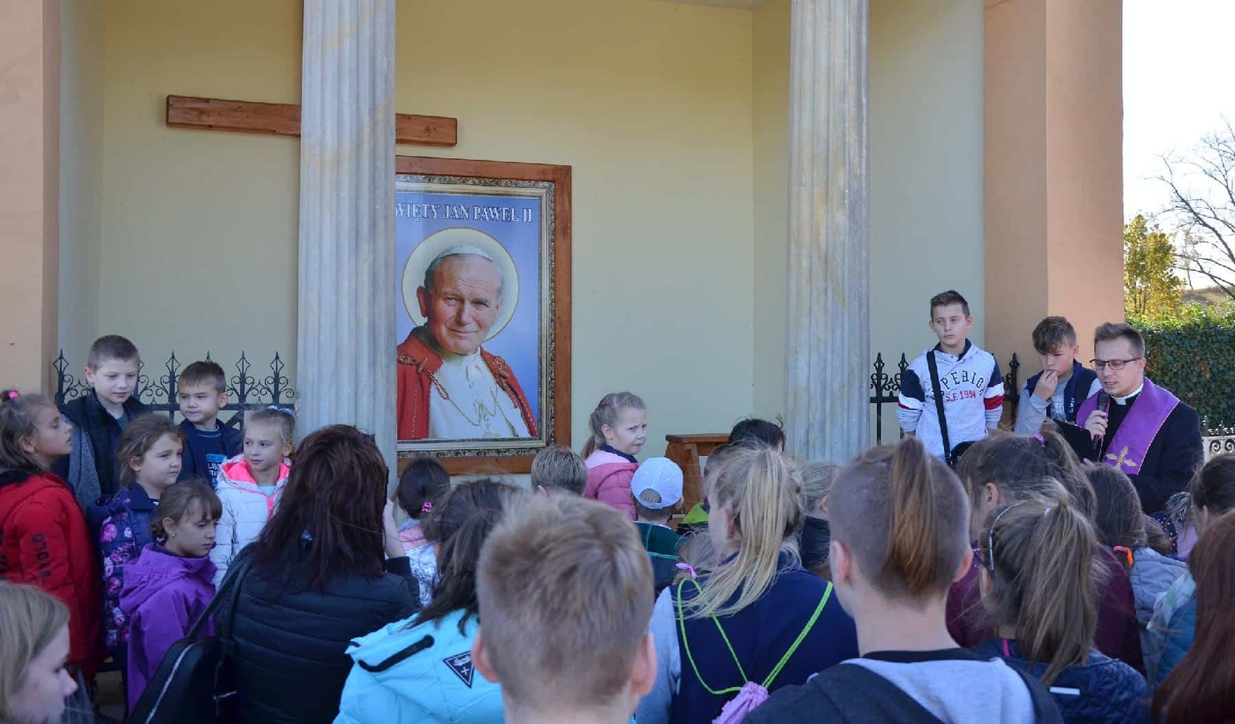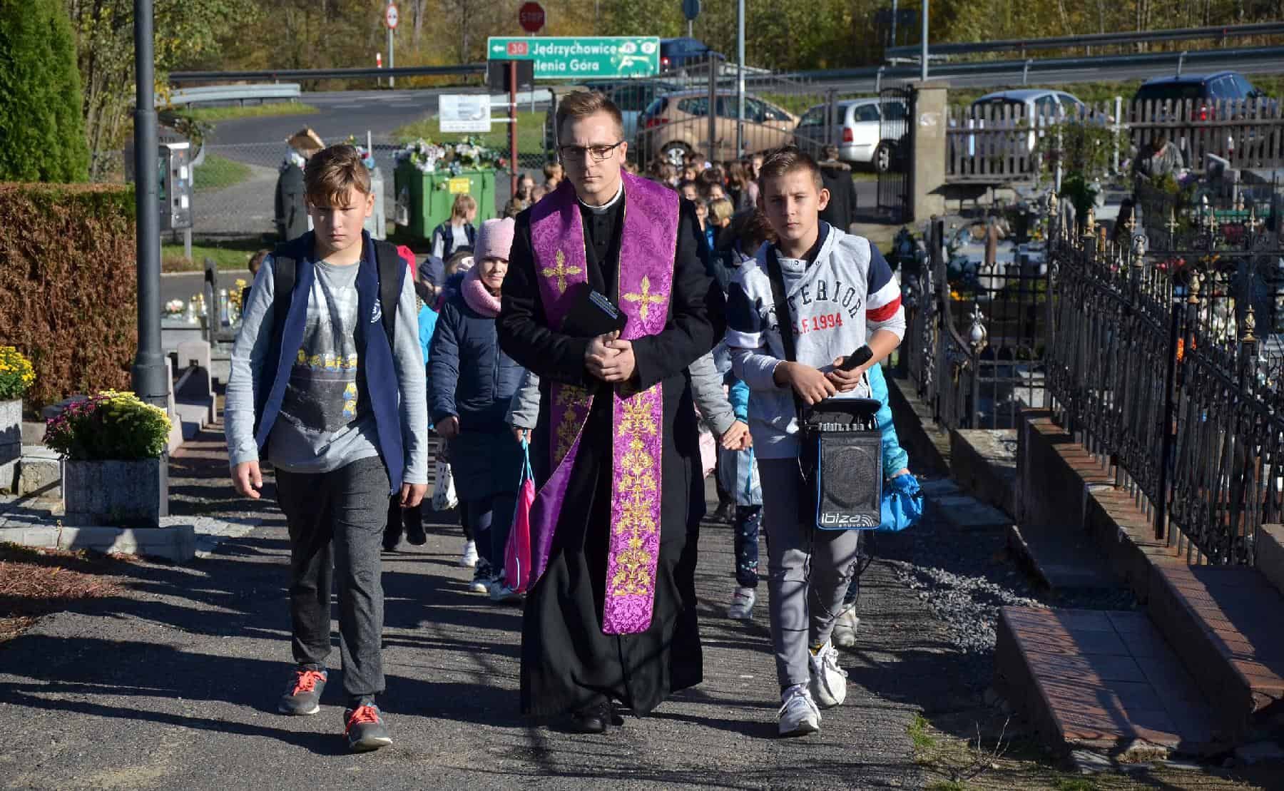 Wyprawa na cmentarz to inicjatywa dyrektor Aliny Męczywór, która o przewodniczenie modlitwie poprosiła ks. Jakuba Sikorskiego, wikariusza parafii pw. św. Józefa Oblubieńca NMP w Olszynie i zarazem katechetę w olszyńskiej „Trójce”.