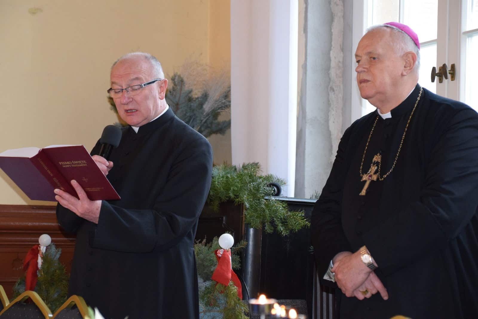 Na początku zebranych przywitał Gospodarz Parafii, ks. Bogdan Żygadło oraz odczytał fragment Ewangelii o narodzeniu Jezusa. Modlitwie przewodniczył ks. biskup, który do zebranych wygłosił słowo wprowadzające w atmosferę tych świąt. Następnie zebrani podzielili się opłatkiem, złożyli życzenia. Był to wyjątkowy moment tego spotkania, gdyż z oczu wielu ludzi starszych płynęły łzy wzruszenia, radości , że mogą być razem.