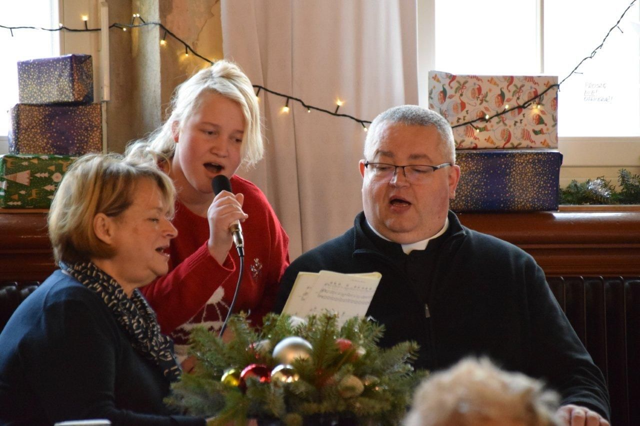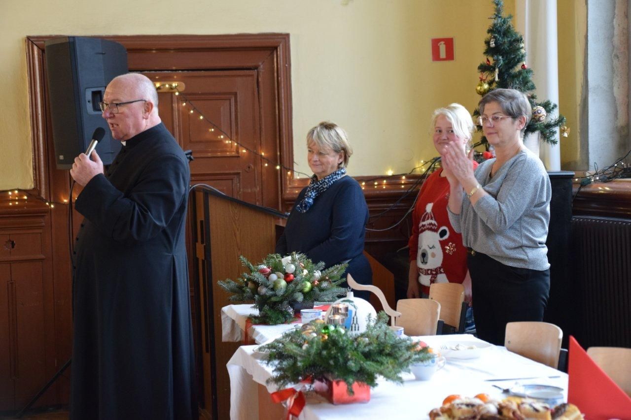 Czas przy bogato zastawionym stole radośnie płynął przy śpiewie kolęd, którym przewodniczył ks. Mariusz Majewski i ks. Proboszcz Bogdan Żygadło wraz z dwiema wolontariuszkami.