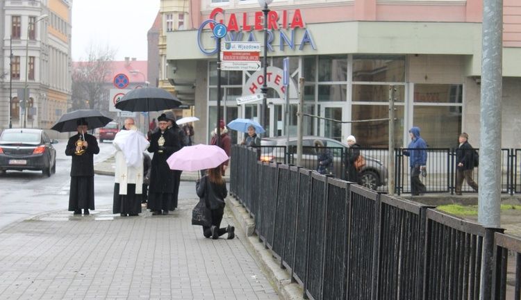 Pełna trasa piątkowej procesji przebiegła następująco: katedra - pl. Słowiański - ul. Wjazdowa - pl. Orląt Lwowskich - ul .Wojska Polskiego - ul. Andersa - ul. Okrzei - ul. Kościuszki - ul. Złotoryjska - ul. Gwarna - ul. Piekarska - Rynek - ul. Powstańców Wielkopolskich - katedra. Obszar parafii jest jednak na tyle duży, że kapłani postanowili podzielić go poszczególne części, które będą odwiedzać co tydzień. - Jeśli tylko będzie się można swobodnie poruszać, w następny piątek pójdziemy inną stroną parafii - tłumaczy ks. Kristman.