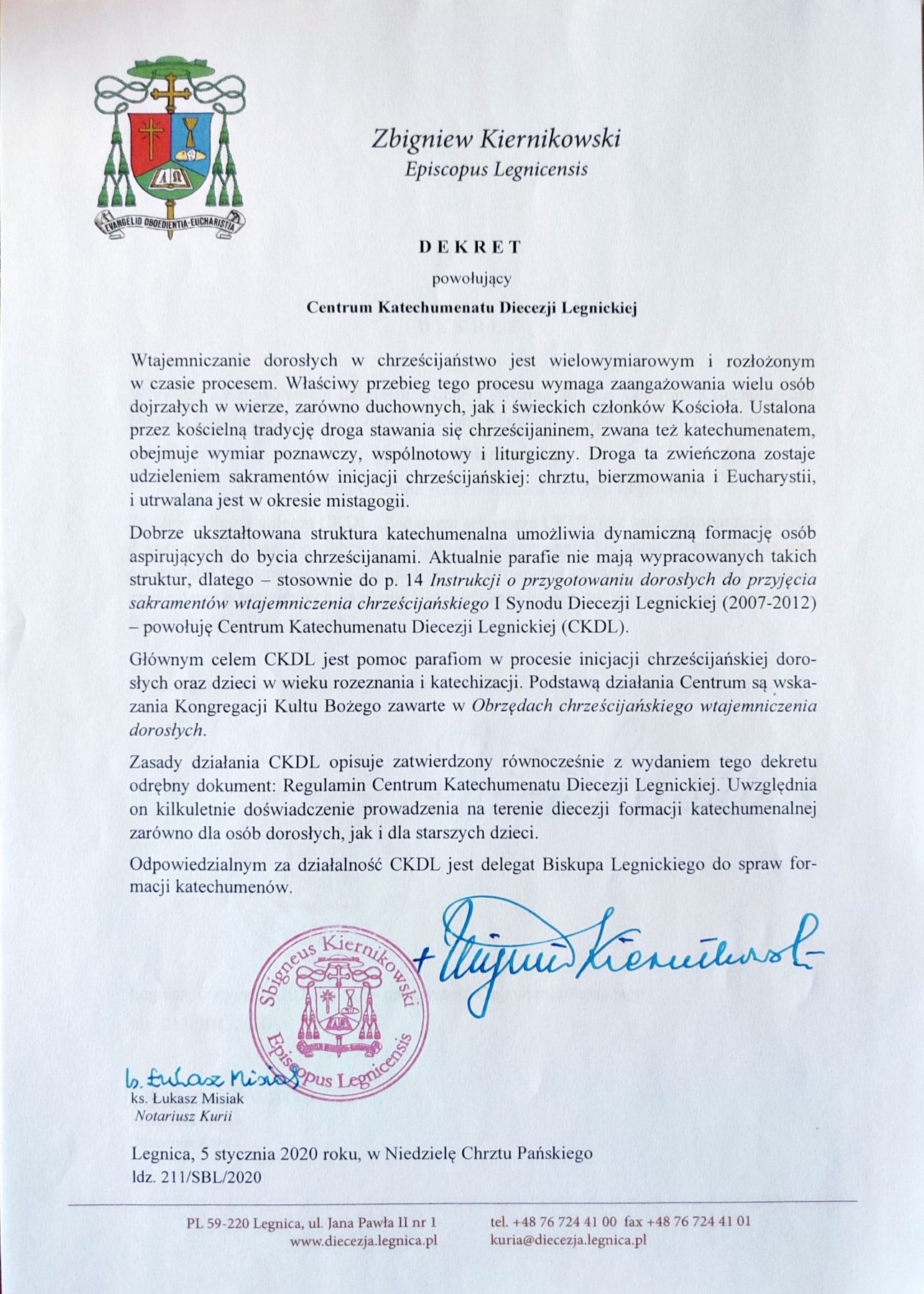 Centrum Katechumenatu Diecezji Legnickiej zostało ustanowione przez biskupa legnickiego Zbigniewa Kiernikowskiego, dekretem dnia 5 stycznia 2020 roku, w Niedzielę Chrztu Pańskiego. Tego samego dnia został zatwierdzony Regulamin CKDL.