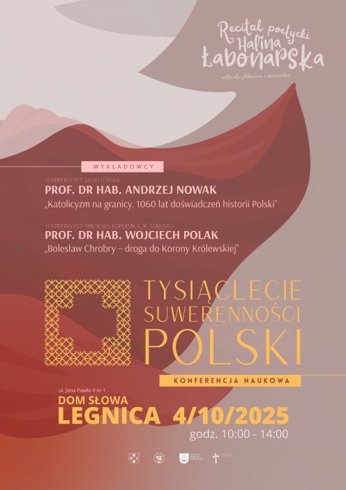 Bractwo Henryka Pobożnego i Duszpasterstwo Ludzi Pracy '90 przy współpracy ze Starostwem Legnickim – zaprasza na konferencję naukową „TYSIĄCLECIE SUWERENNOŚCI POLSKI”, która odbędzie się 4 X 2025 r. (sobota), godz. 10.00-14.00 w Domu Słowa w Legnicy, ul. Jana Pawła II nr 1 z udziałem: p. Haliny Łabonarskiej (recital poetycki) oraz prof. dr. hab. Andrzeja Nowaka i prof. dr. hab. Wojciecha Polaka (wykłady).
