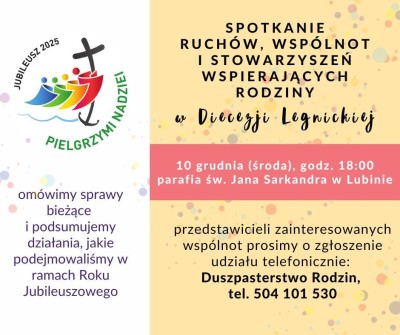 Więcej informacji i zaproszeń na stronie Diecezji Legnickiej w zakładce ZAPROSZENIA oraz na stronie Duszpasterstwa Rodzin.