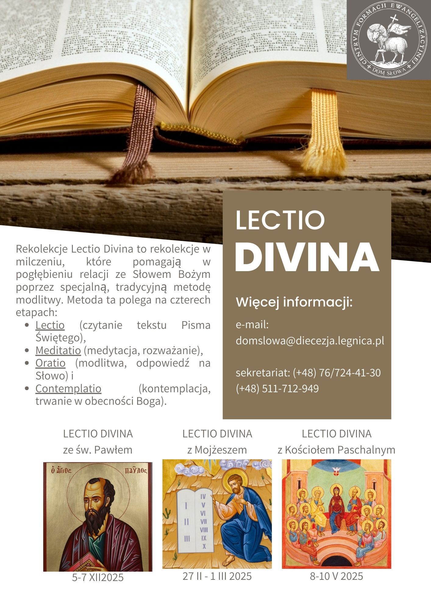 Rekolekcje Lectio Divina to rekolekcje w milczeniu, które pomagają W pogłębieniu relacji ze Słowem Bożym poprzez specjalną, tradycyjną metodę modlitwy. Metoda ta polega na czterech etapach: